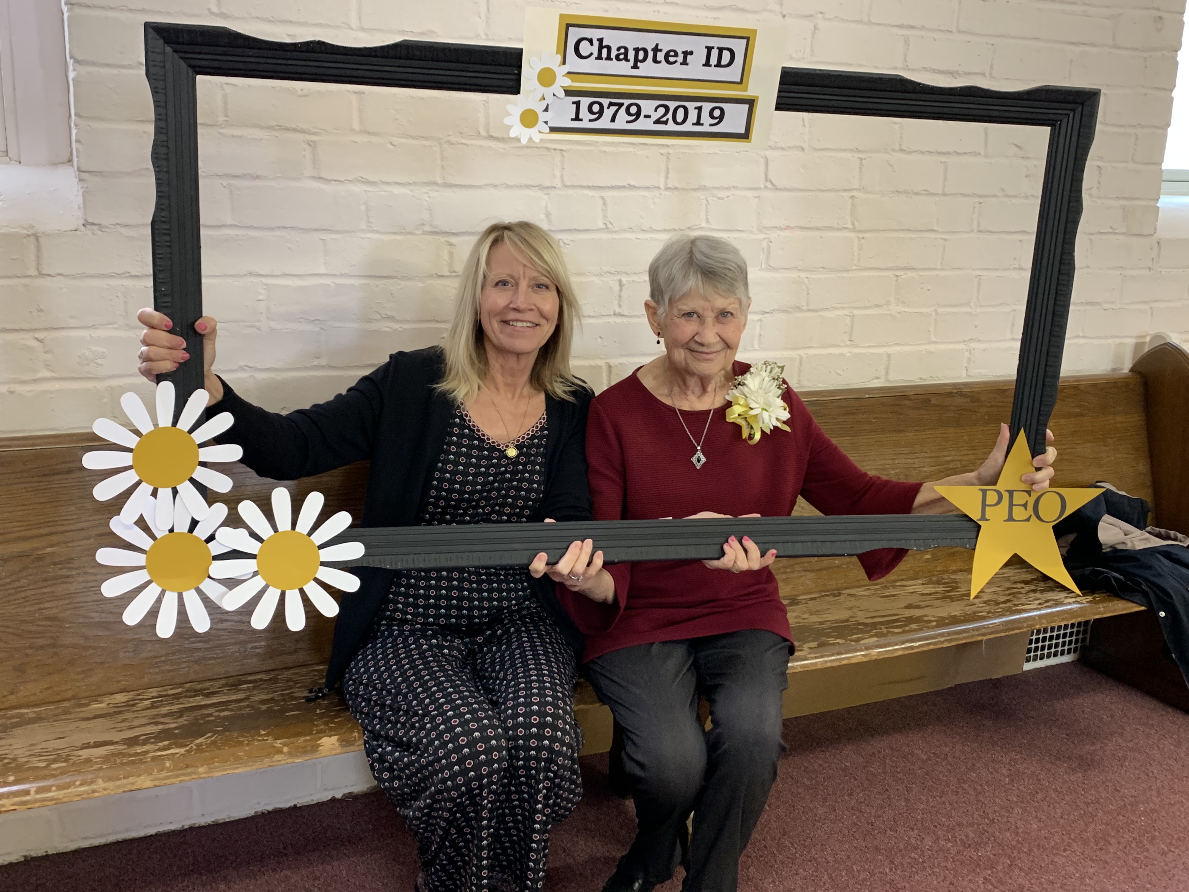 Painting of two women, one with angel wings and halo, smiling.