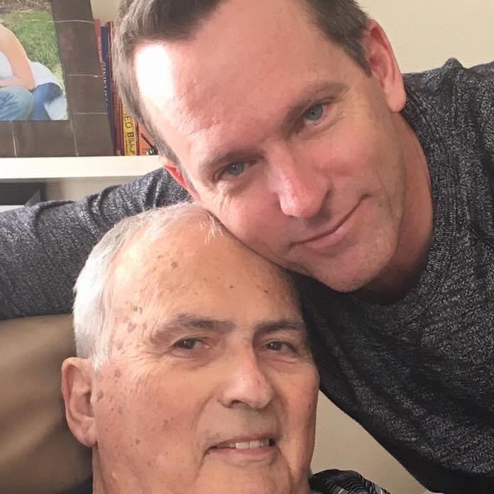 Painting of an older man and a younger man, the younger man`s arm around the older man`s shoulder.