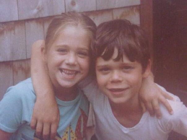 Oil painting of two smiling children, a girl with blonde hair and a boy with brown hair, hugging.