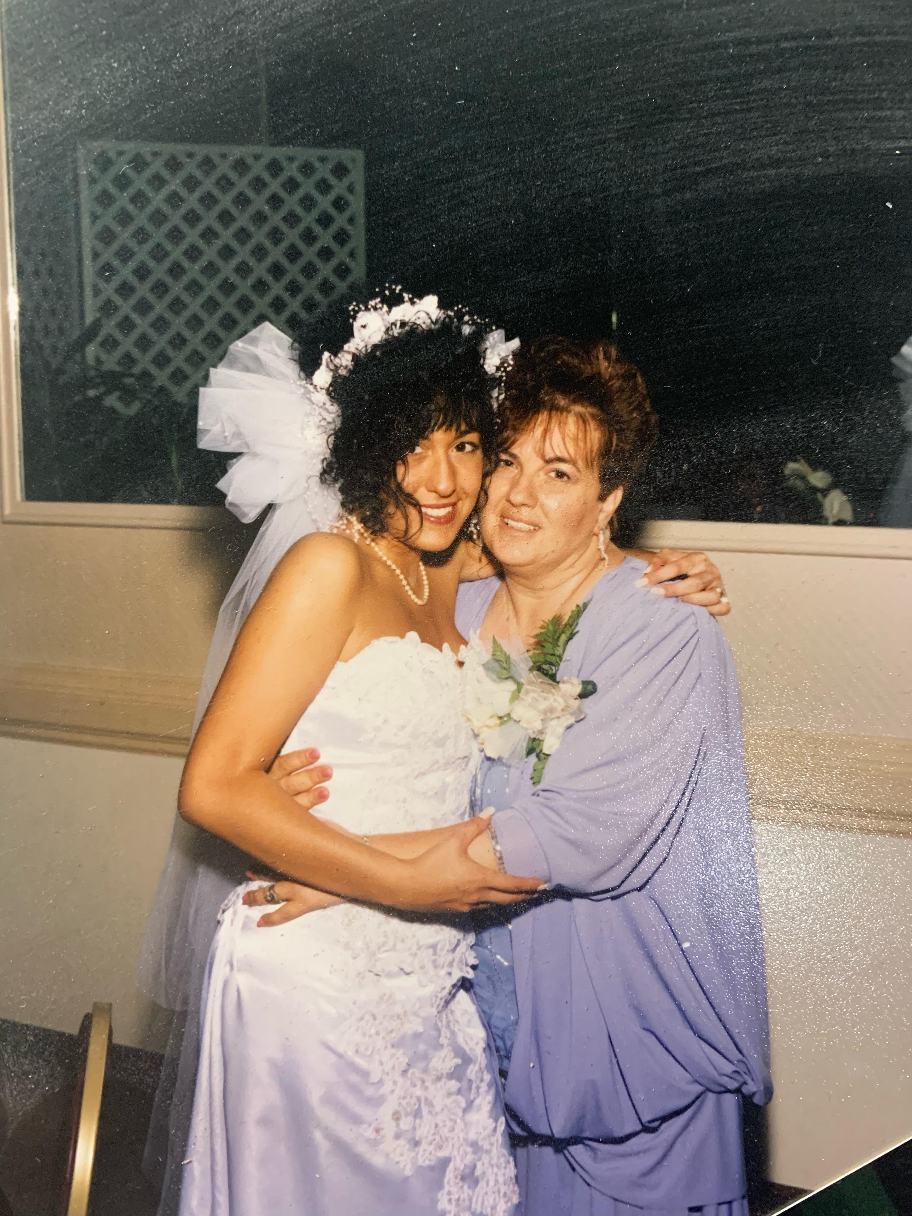 Painted portrait of two women with long dark hair, against a yellow autumnal background.