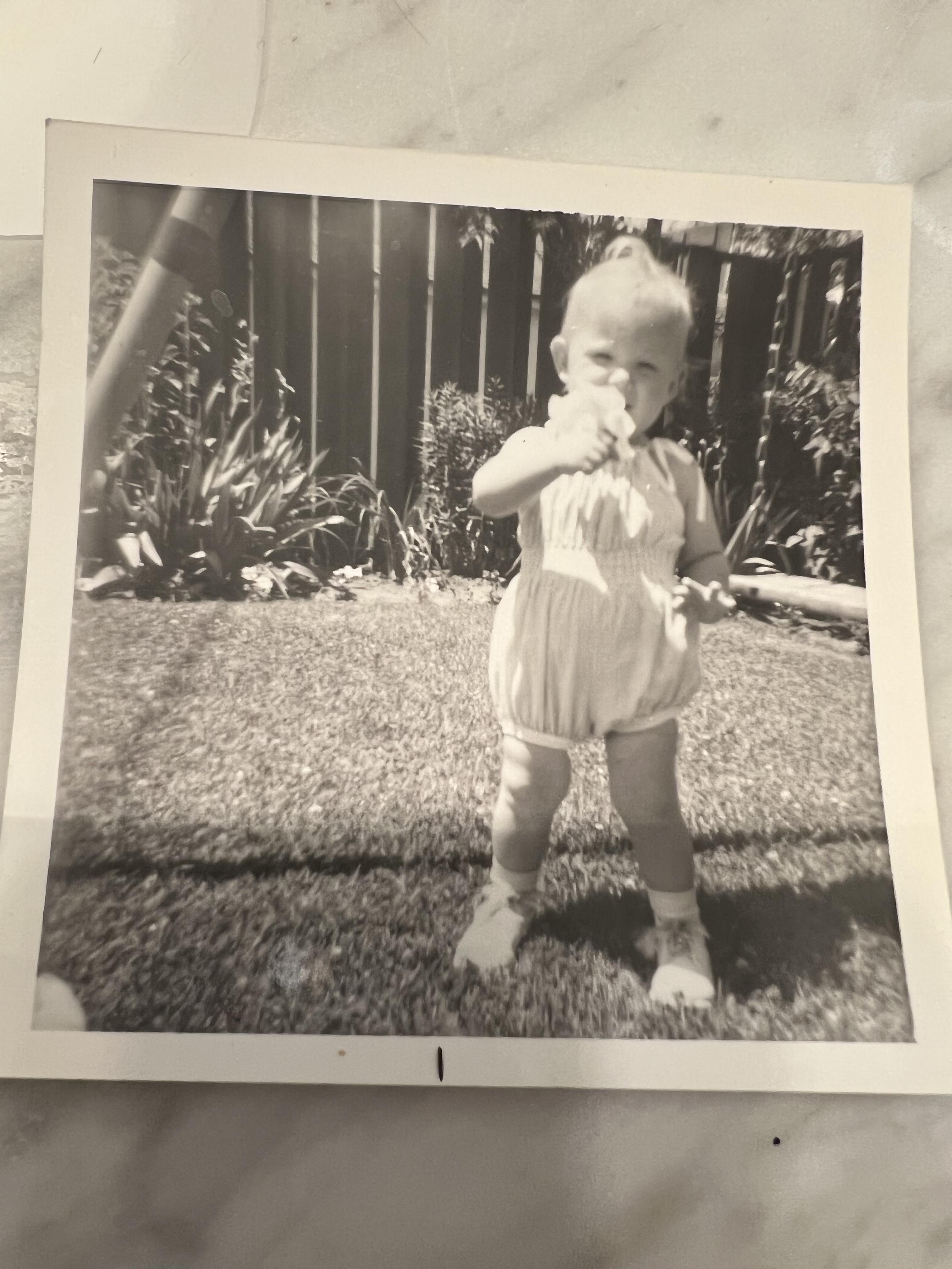 Painting of a toddler in a light blue romper eating something outdoors.