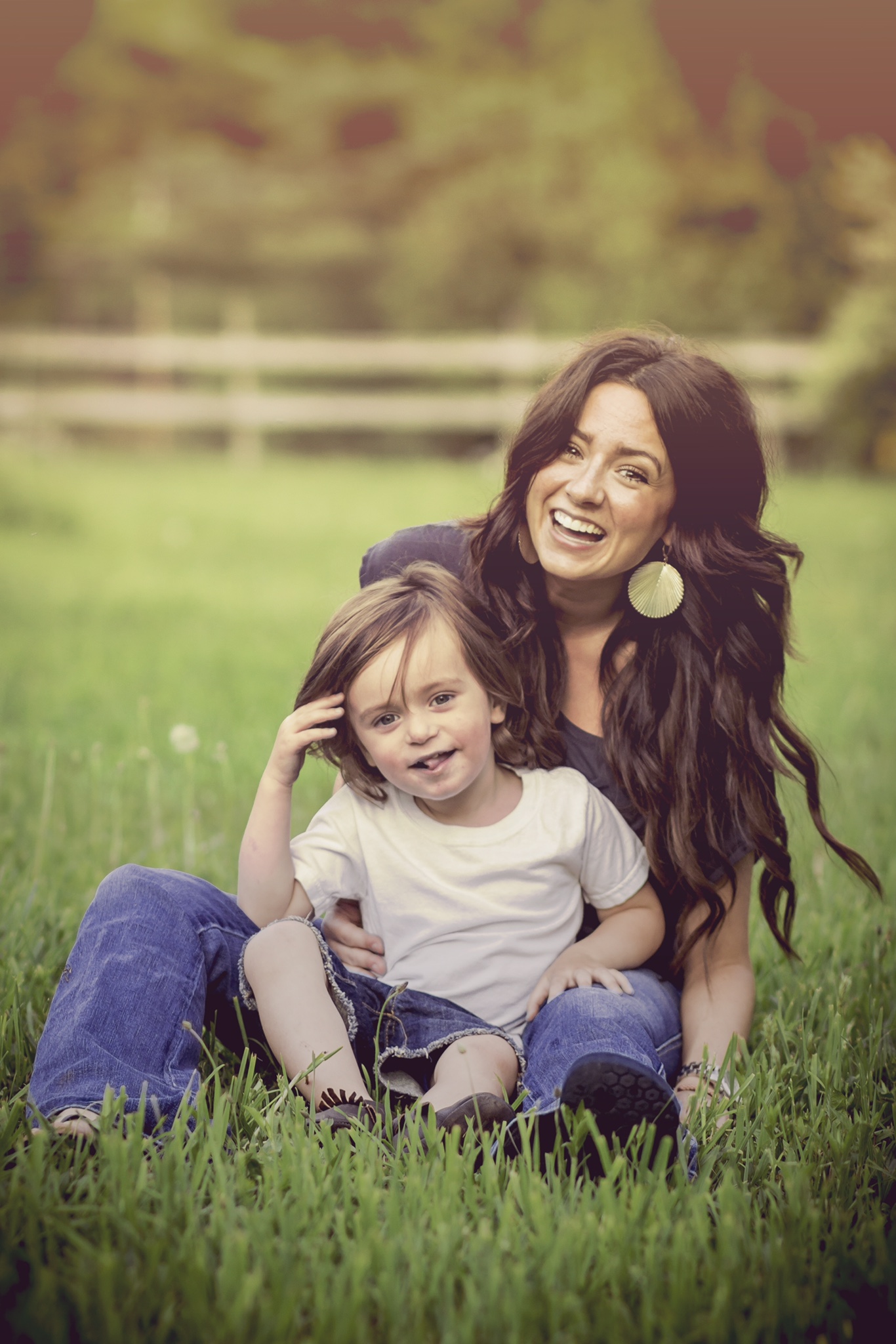 Painting of a smiling mother and daughter sitting in a grassy field.