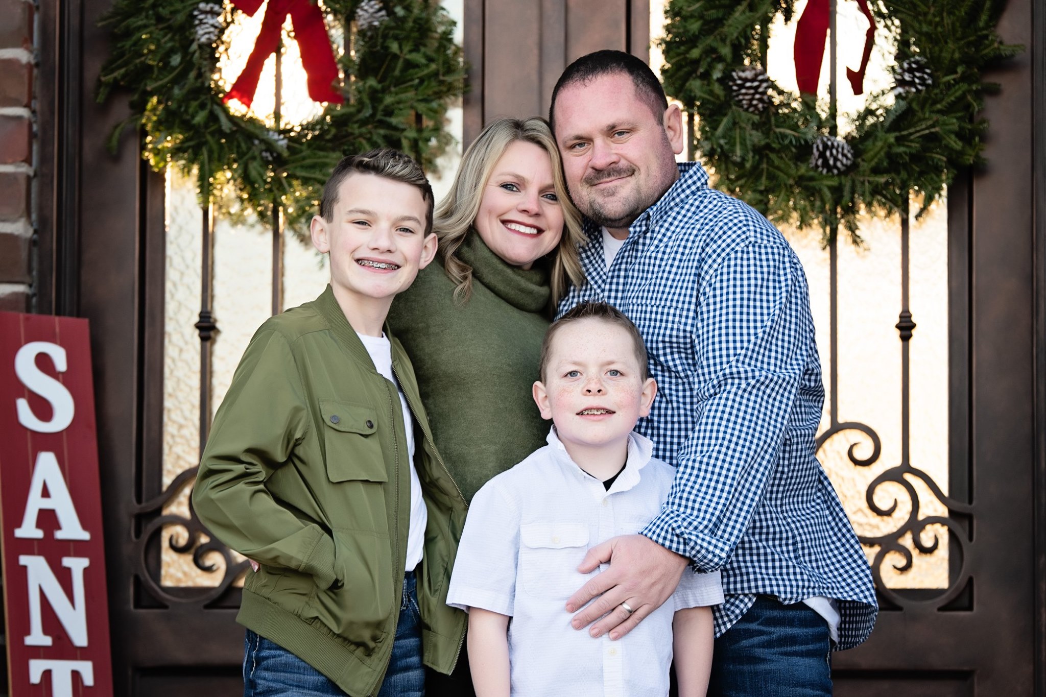 Painted portrait of a family of four standing in front of a door decorated with Christmas wreaths.