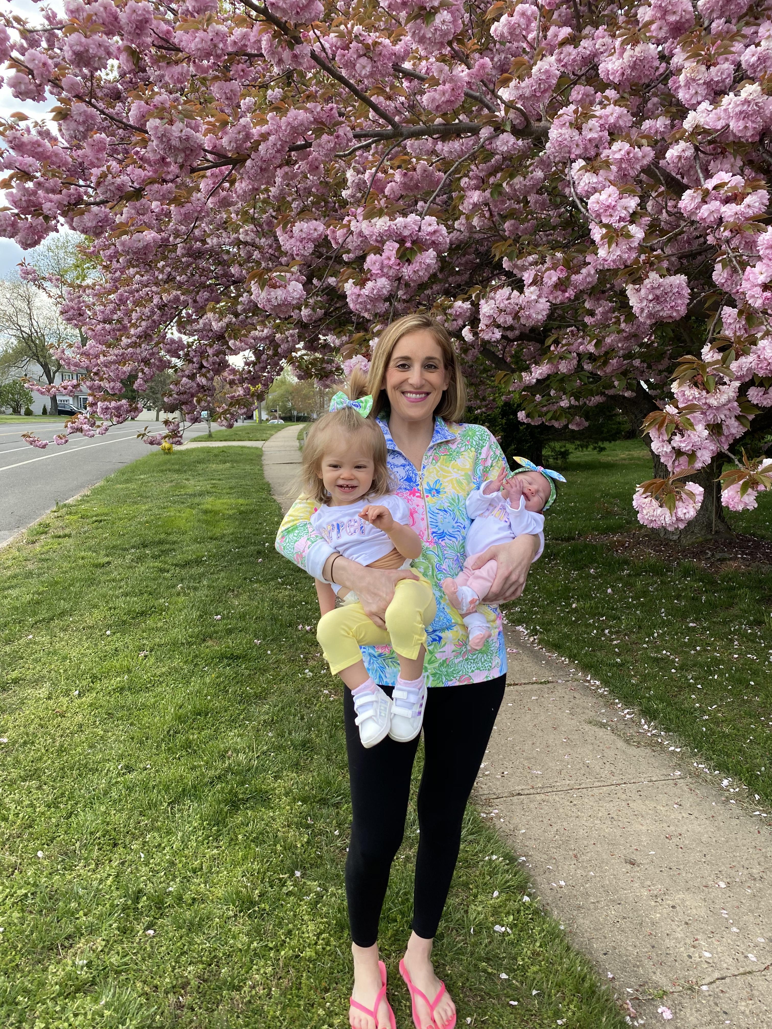 Painting of a mother holding a toddler and a baby in front of blooming trees.