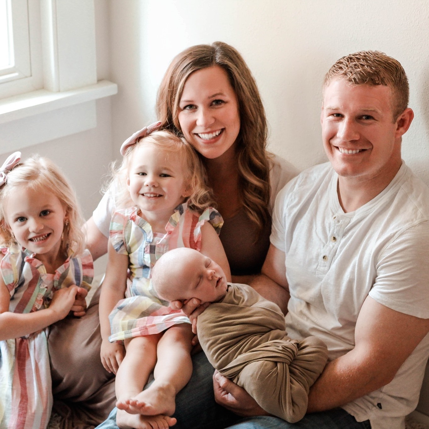 Family portrait painting: parents and two young daughters holding a newborn baby.