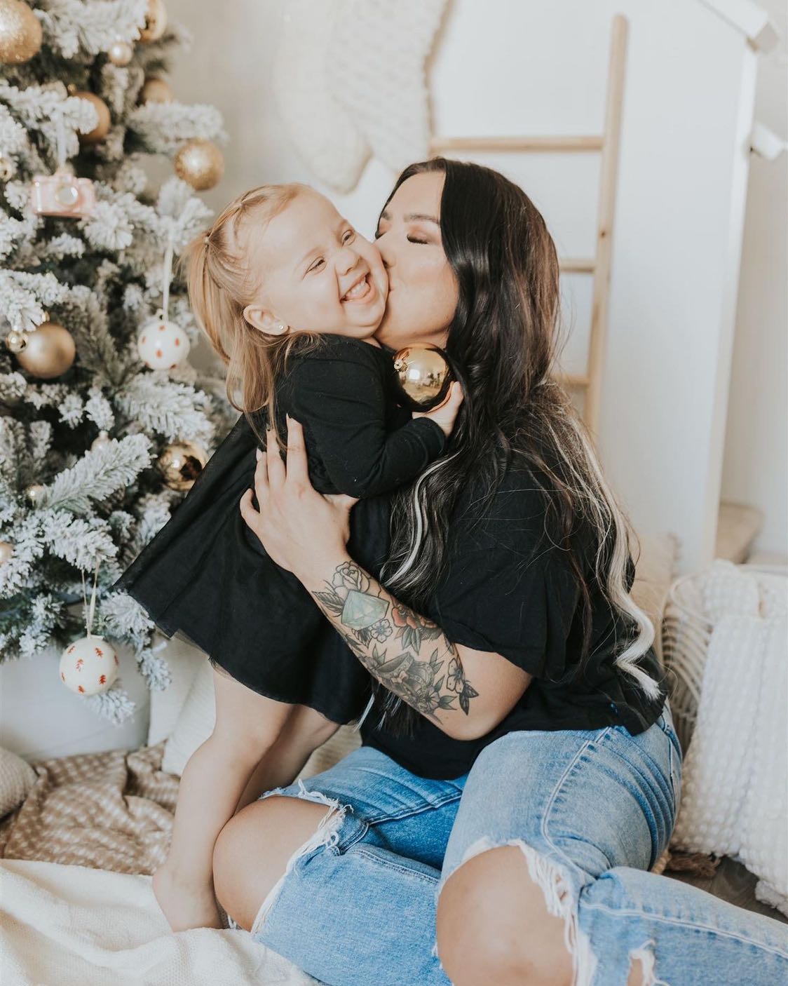 Painting of a mother kissing her toddler daughter near a Christmas tree.