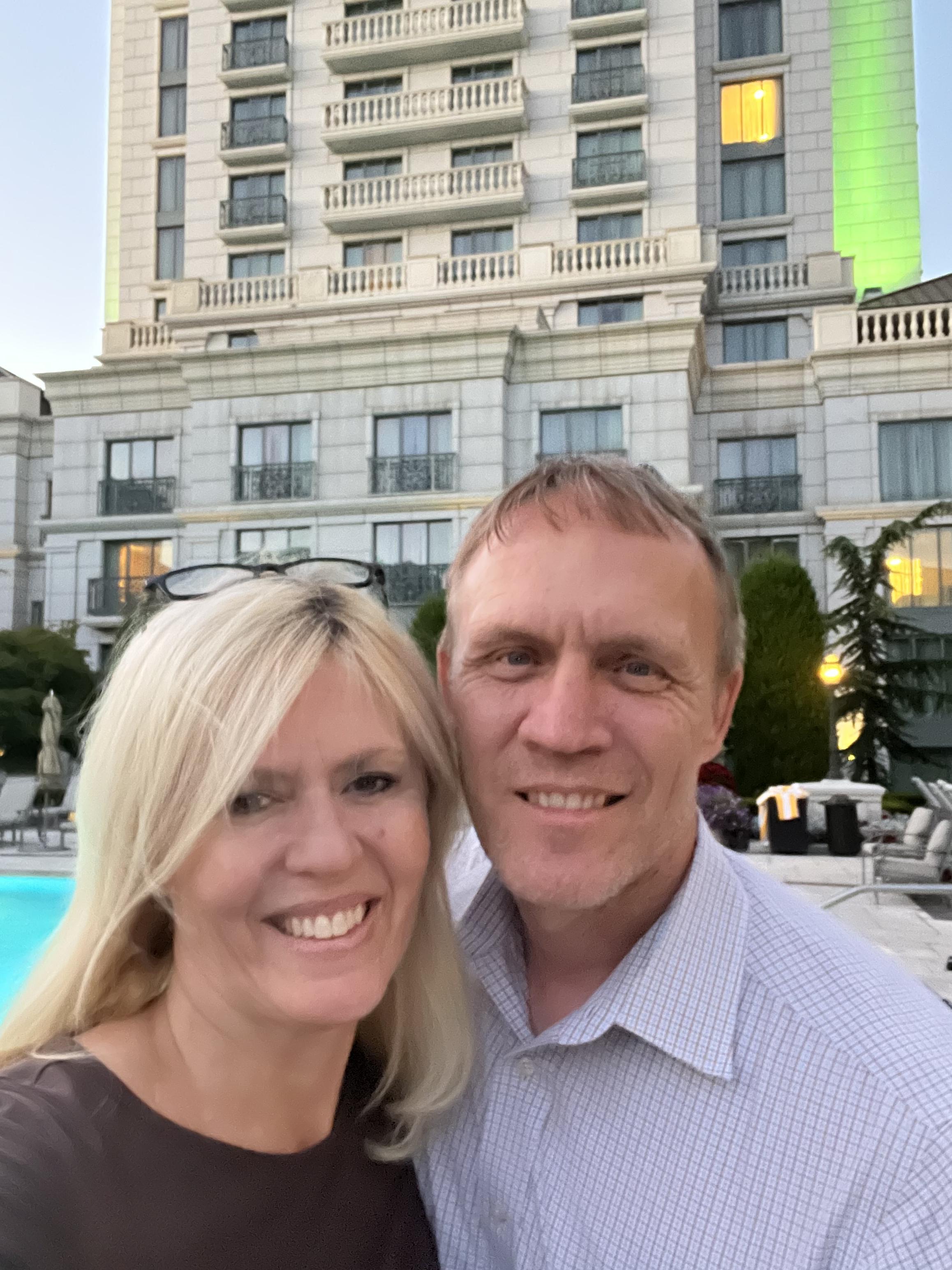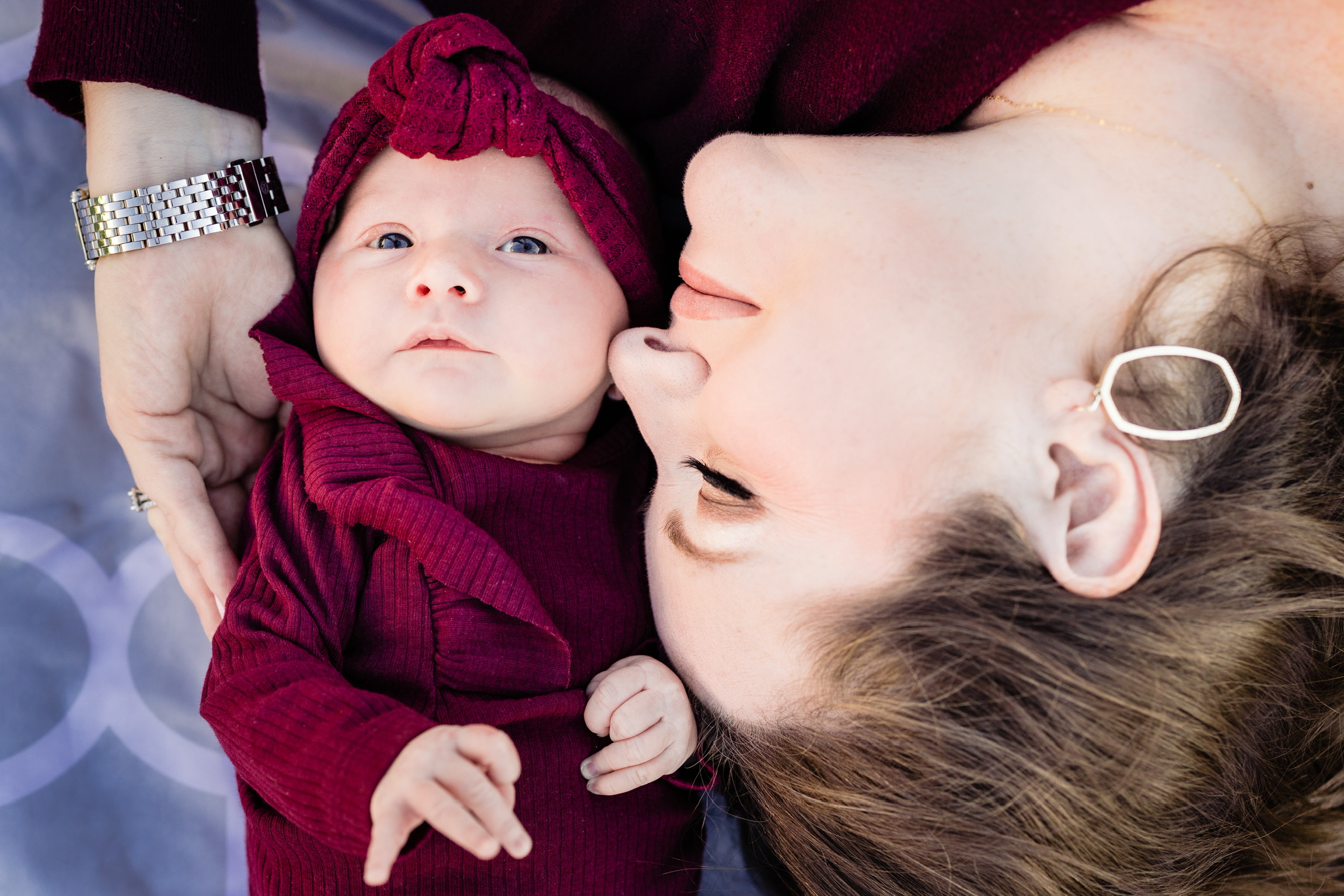 Portrait of a tattooed father lifting his baby in the air while laughing with his wife by the water.