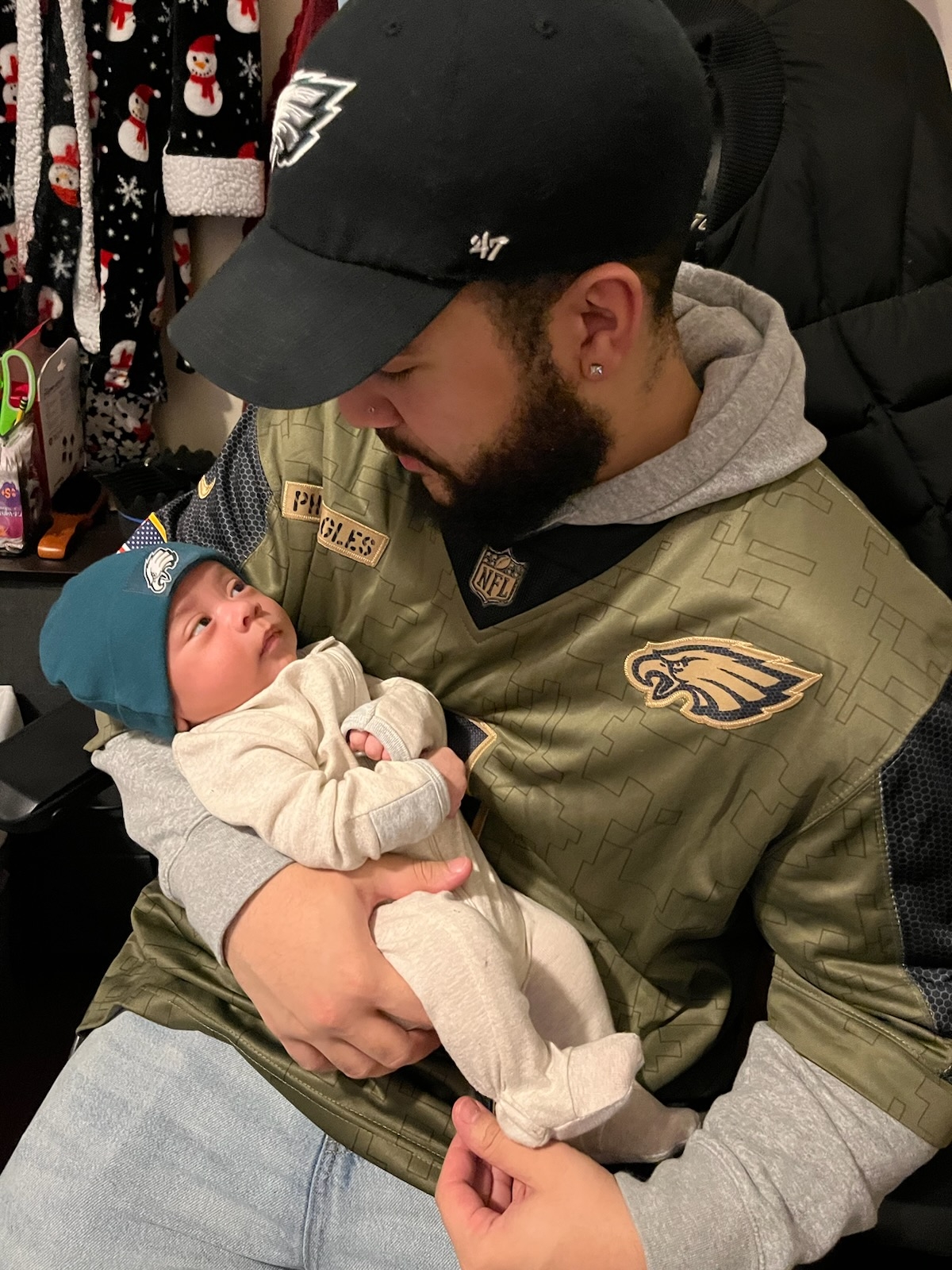 Painting of a father in a Philadelphia Eagles jersey holding his newborn baby.