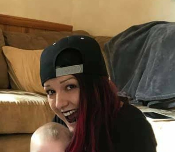 Painting of a woman with purple hair and a baseball cap, embracing a young girl and boy.