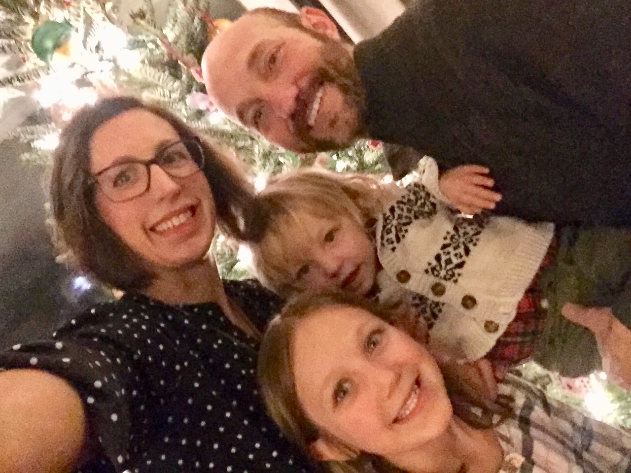Oil painting portrait of a family: a pilot father wearing sunglasses, his wife, and their two young daughters.