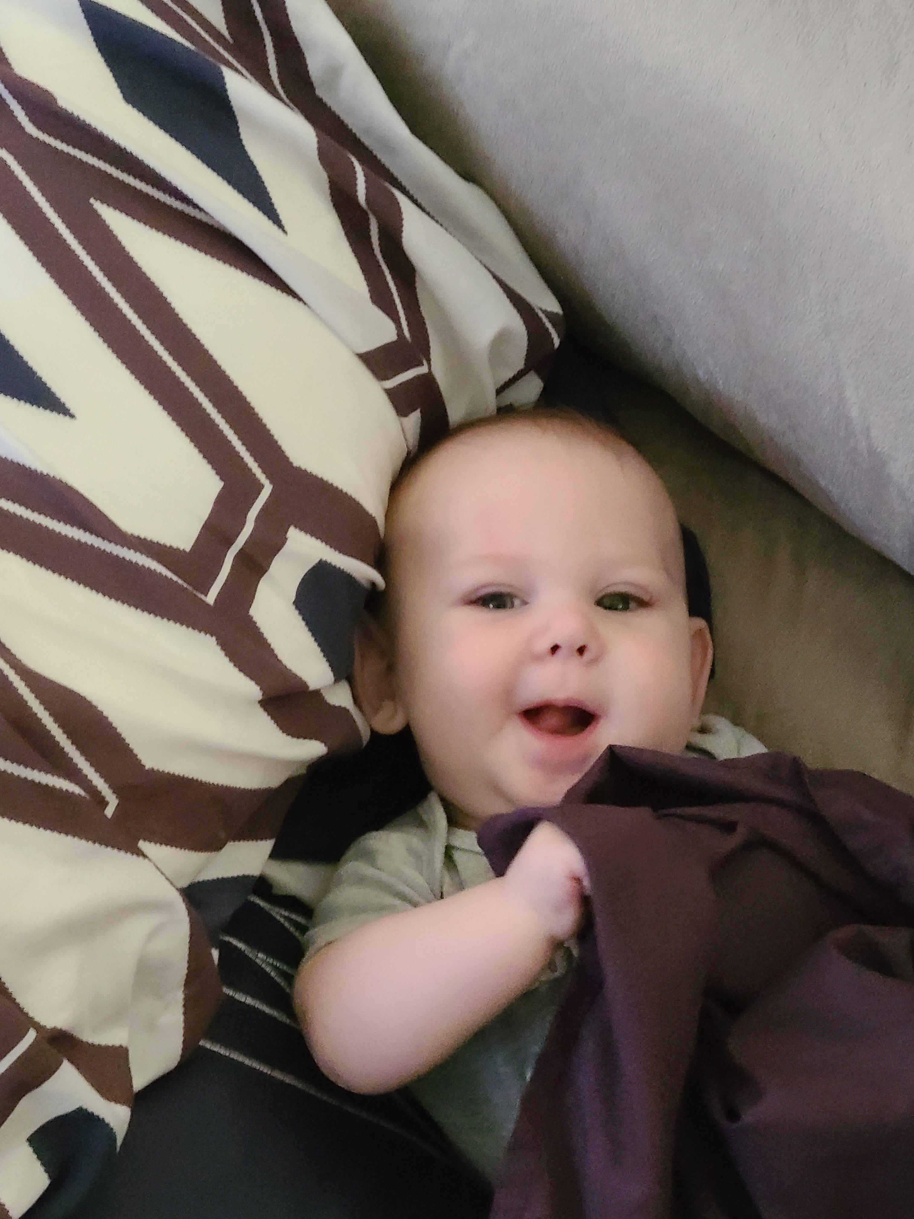 Oil painting of a mother and daughter.  The mother wears glasses and a pink shirt, the toddler wears a denim vest.