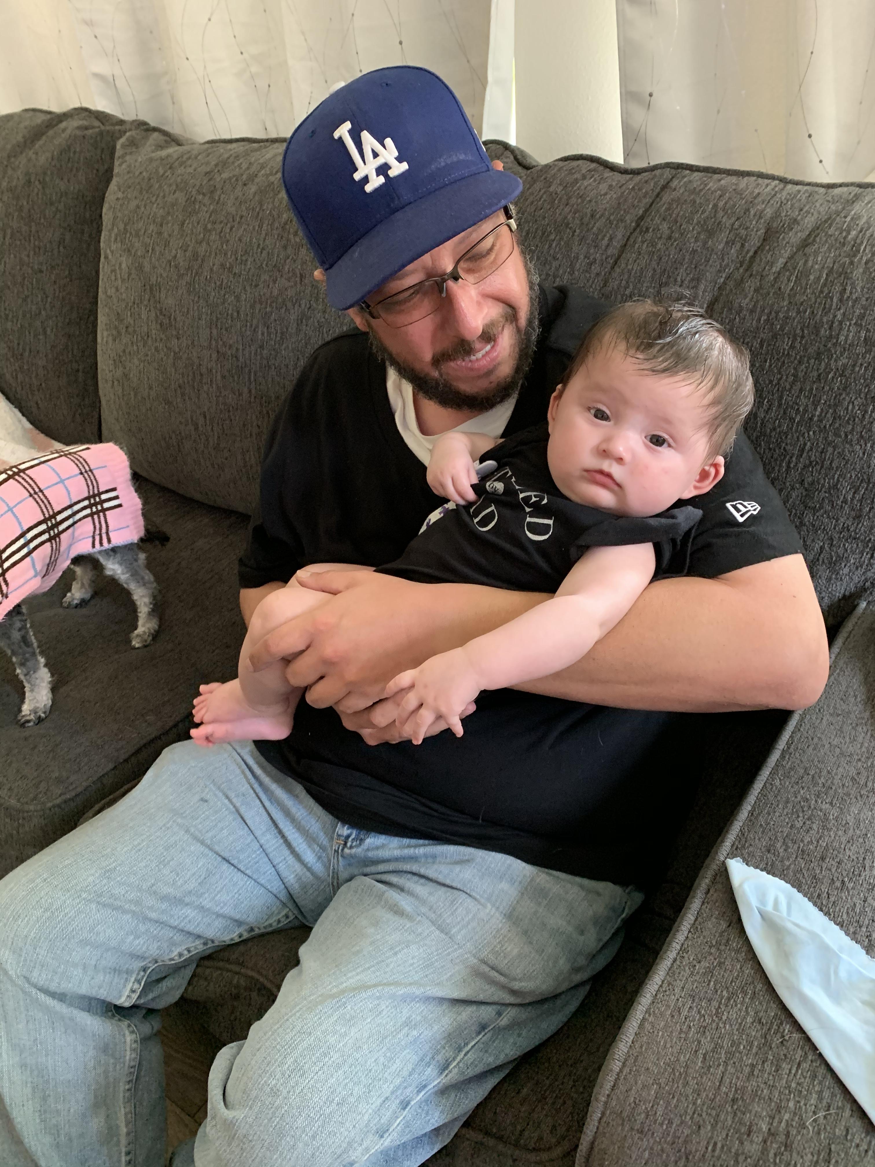 Black and white pencil drawing of a father holding his baby.