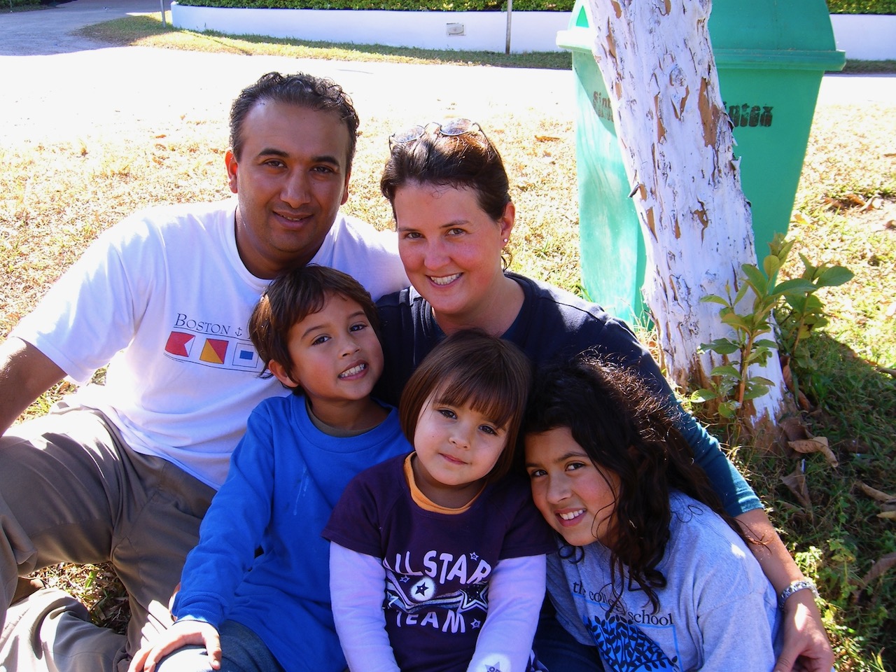 Family portrait painting: parents and two sons outdoors.