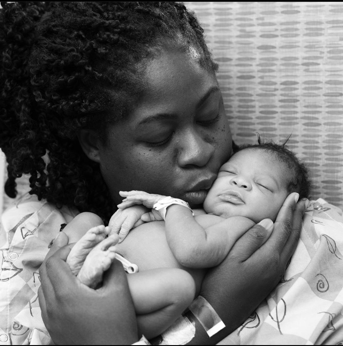Black and white painting of a mother tenderly holding and kissing her newborn baby.
