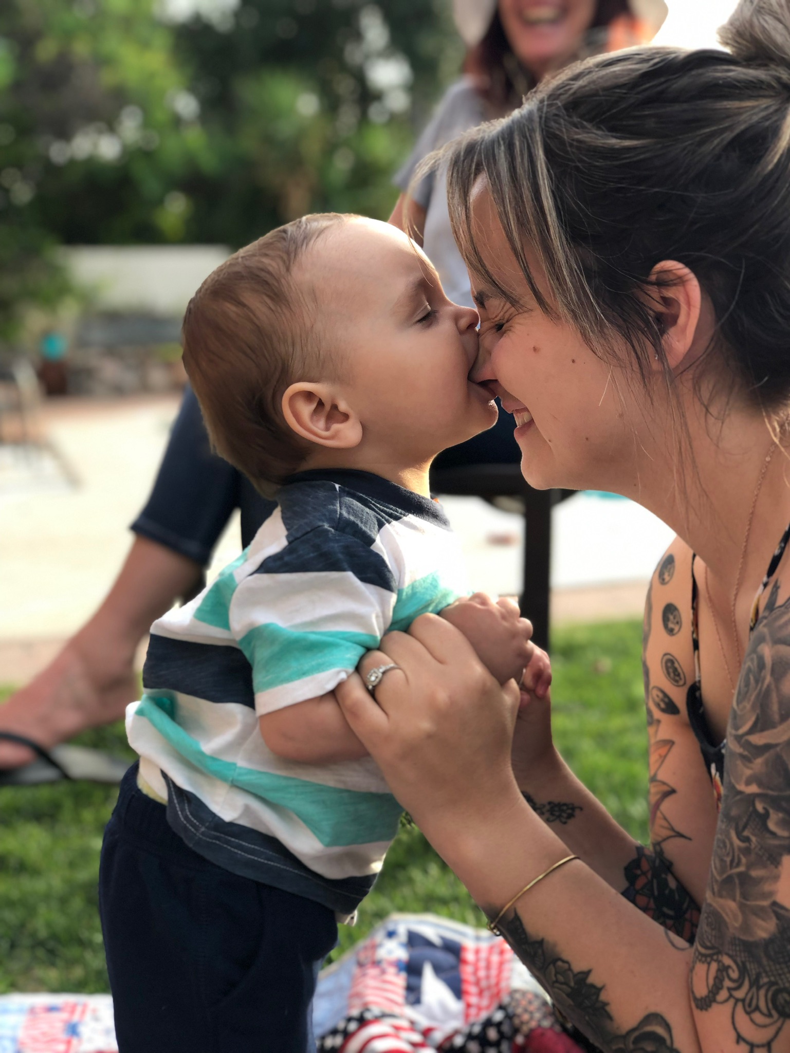 Painting of a mother and baby nuzzling noses.
