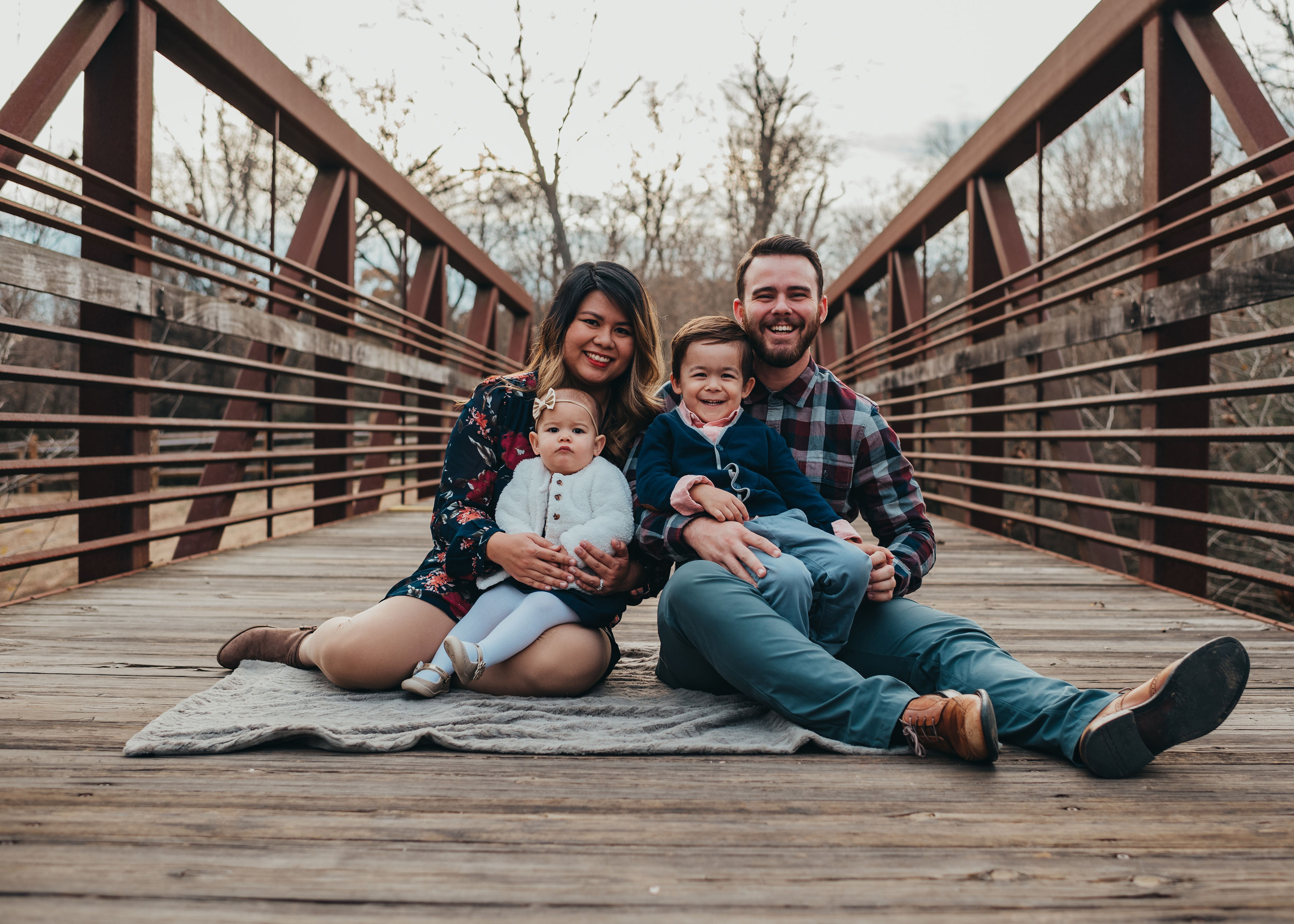 Watercolor portrait of a family: a man with glasses and a baseball cap, a woman with sunglasses, and a toddler on the man`s shoulders.  Pink blossoms are in the background.