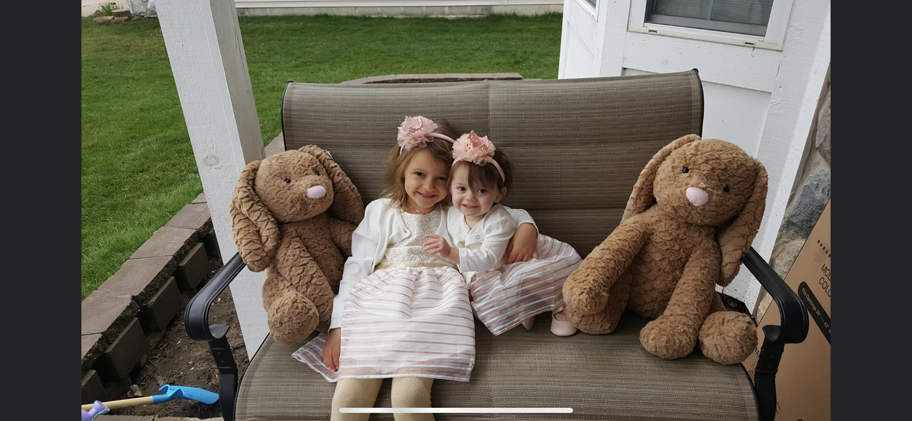 Painting of a mother and her two young daughters sitting on a couch with a stuffed animal.