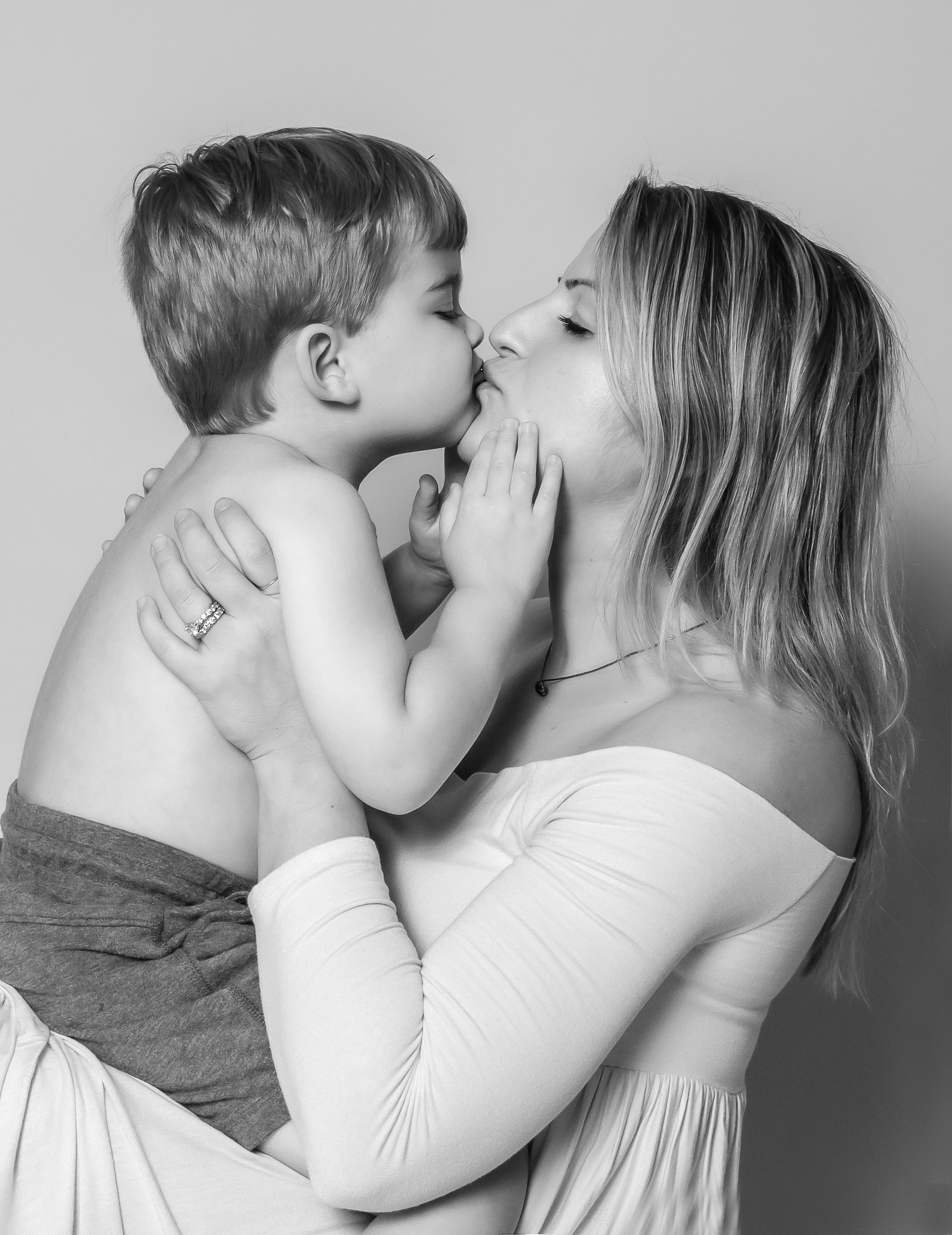 Black and white painting of a mother and young son kissing.