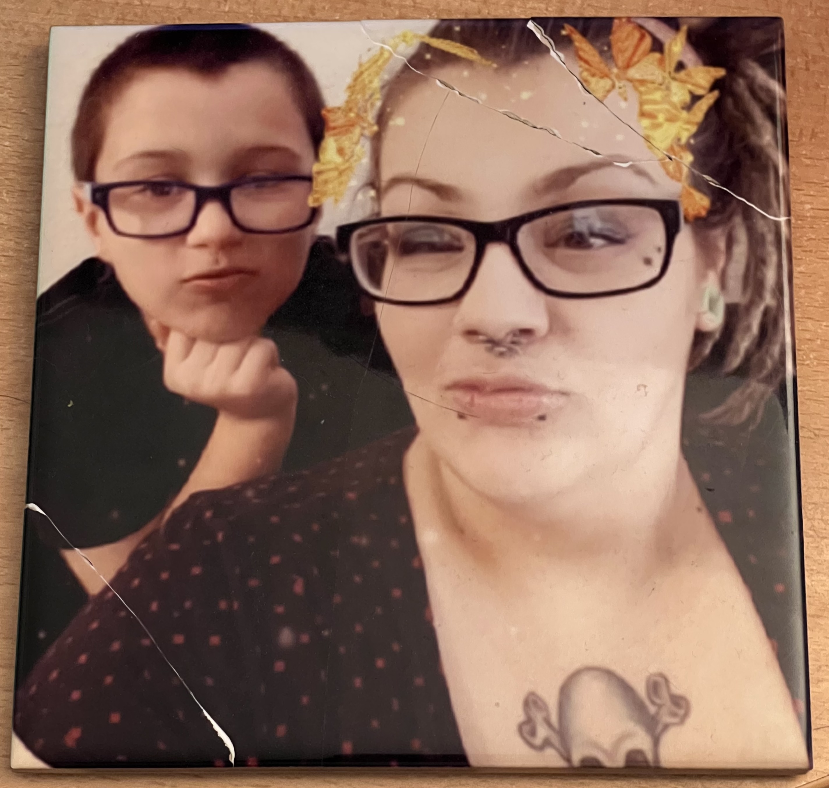 Painted portrait of a woman with teal and green hair and glasses, and a boy with short dark hair, both looking at the viewer.