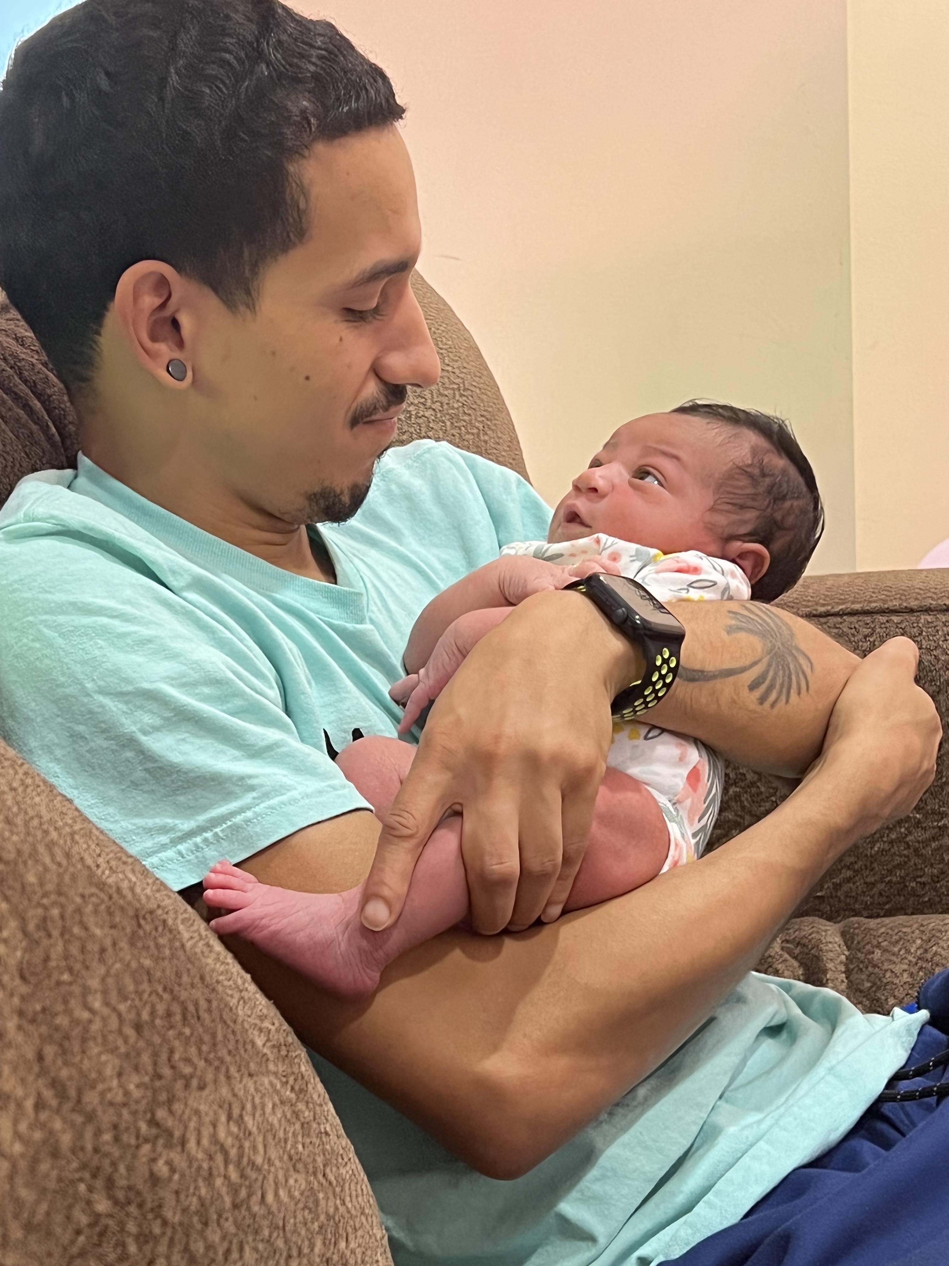 Painting of a father cradling his newborn baby.