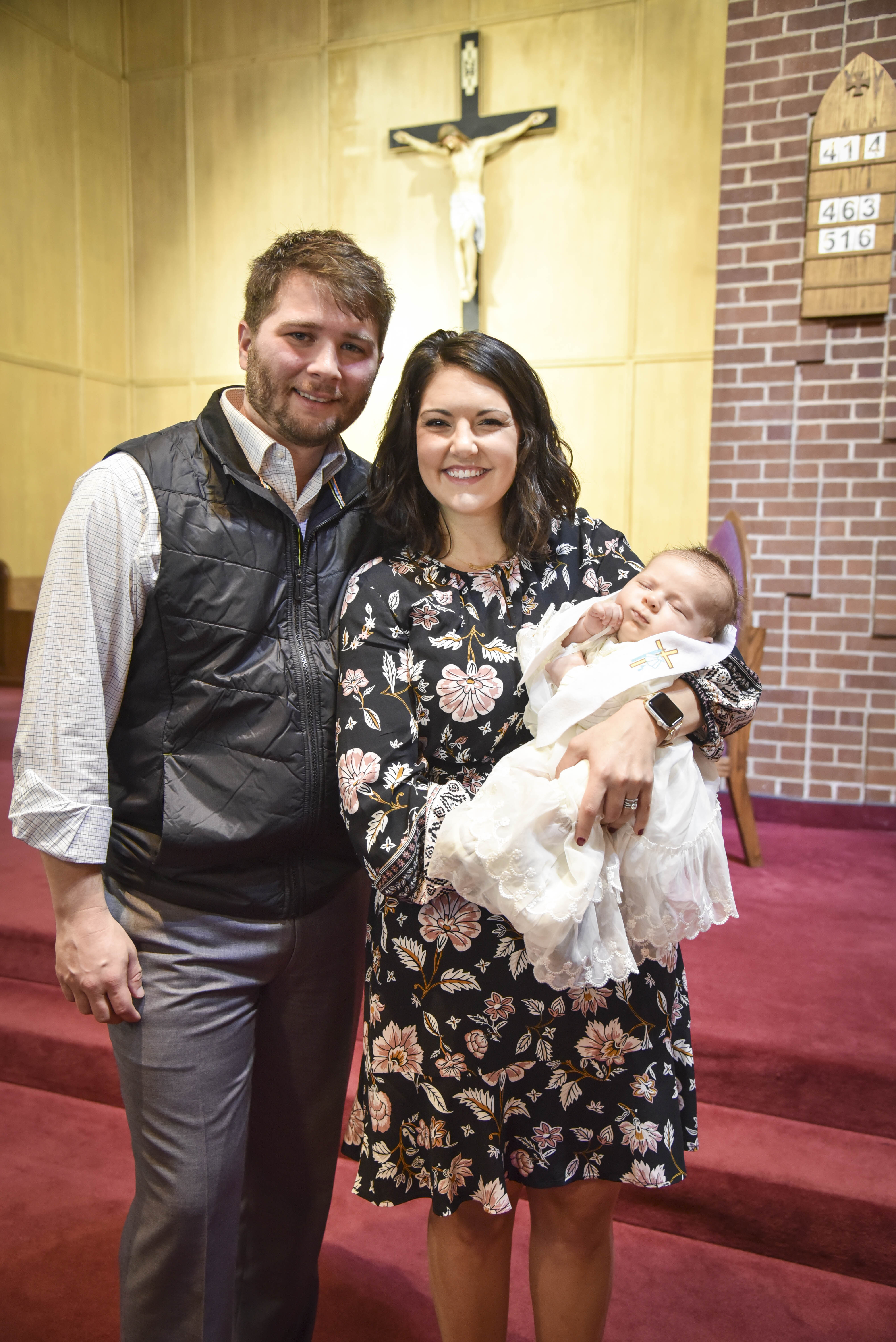 Oil painting of a family portrait: a man, woman, and baby.