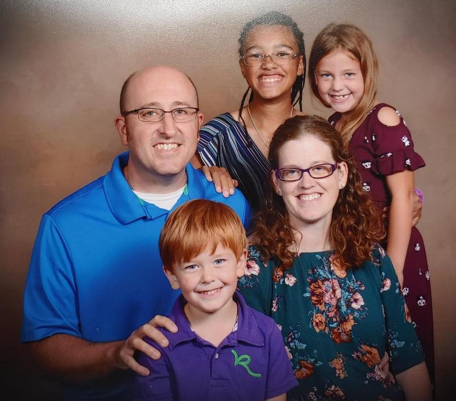 Family portrait painting, two parents, three children.