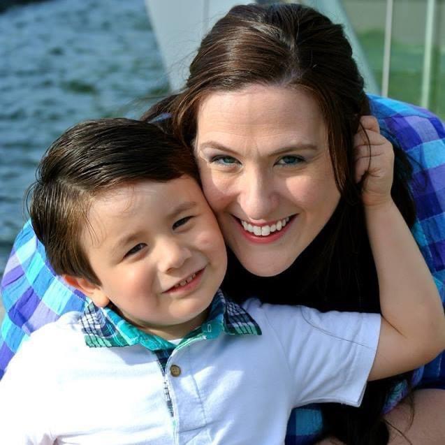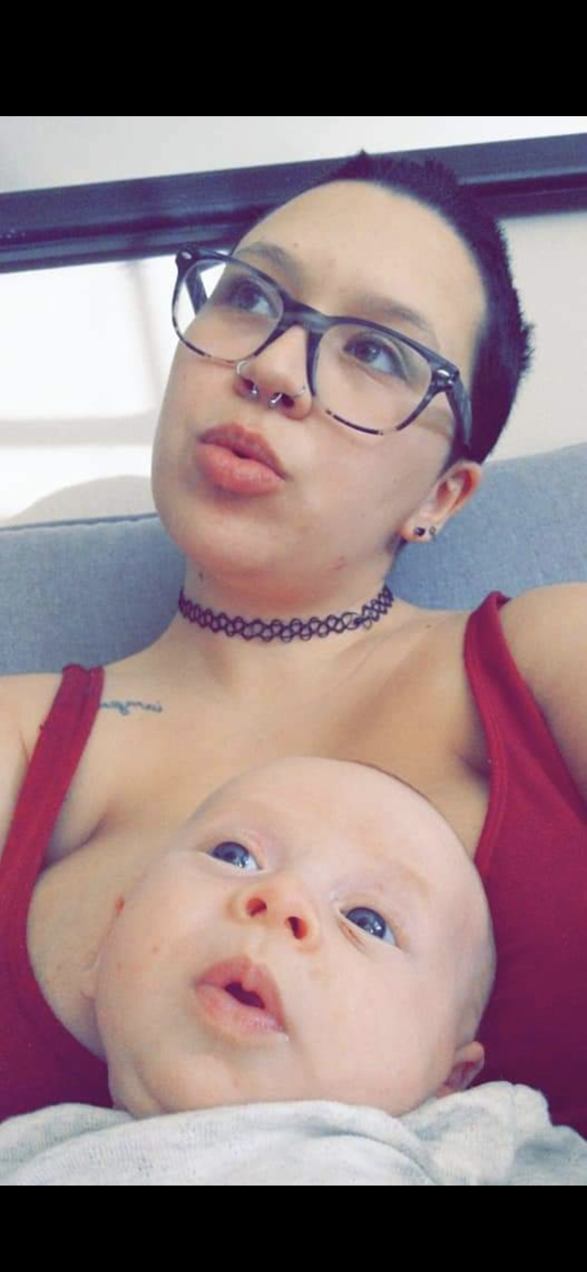 Painting of a mother and baby, the mother wears glasses and a red top.