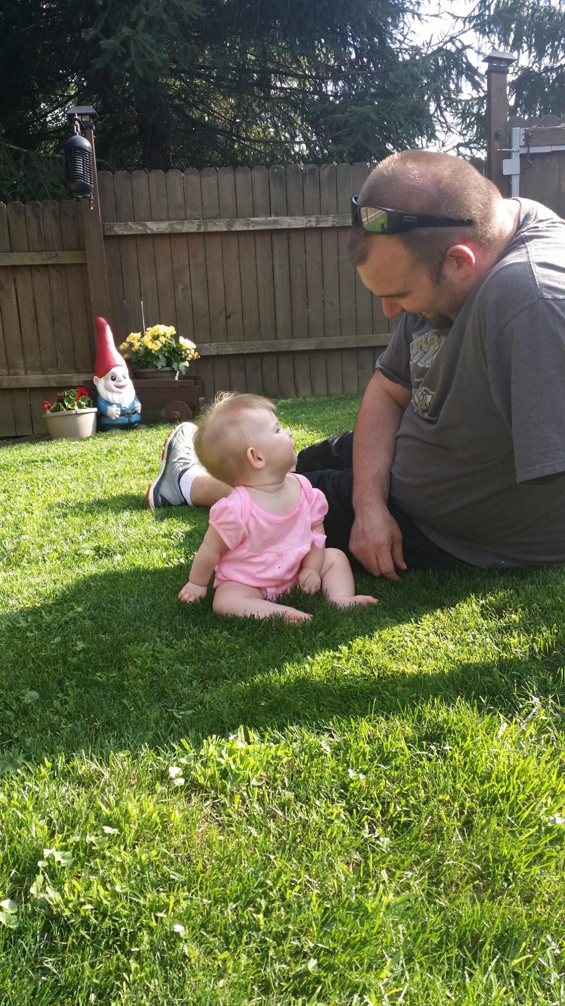 Painting of a father and baby daughter sitting on the grass, looking at each other.