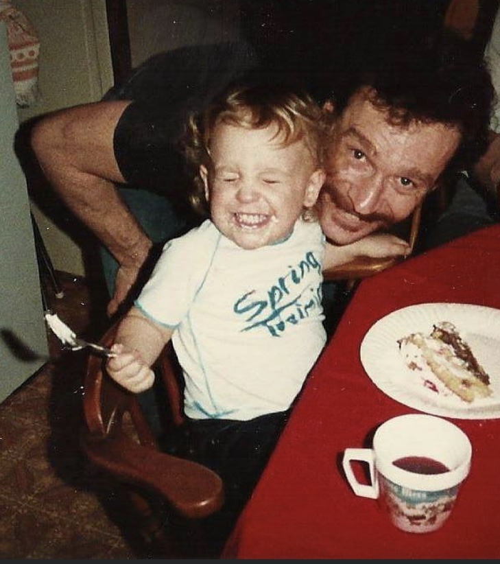 Painting of a smiling toddler in a ??pring Tour??shirt leaning on a man, with pastry and coffee on a table.