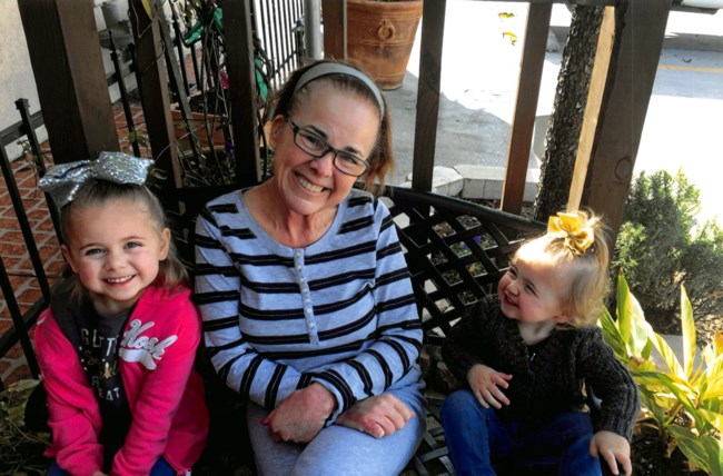 Painting of a grandmother and two young granddaughters sitting together.