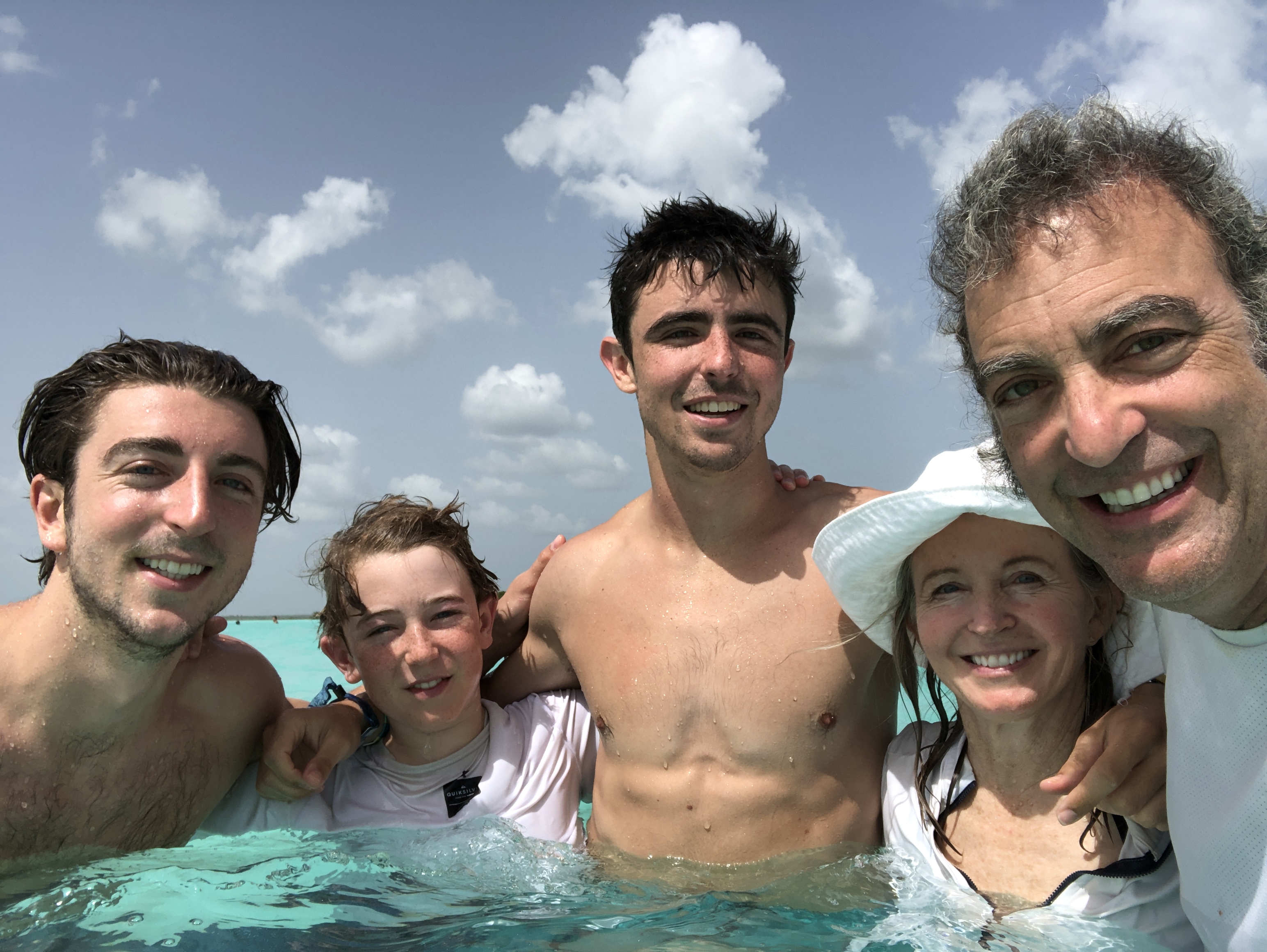 Painting of a family of five smiling in shallow water.