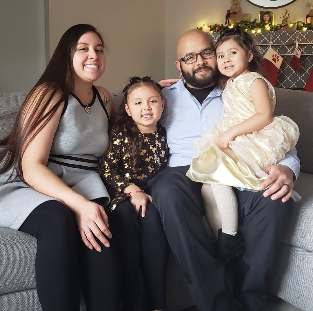Family portrait painting of a mother, father, and two young daughters.