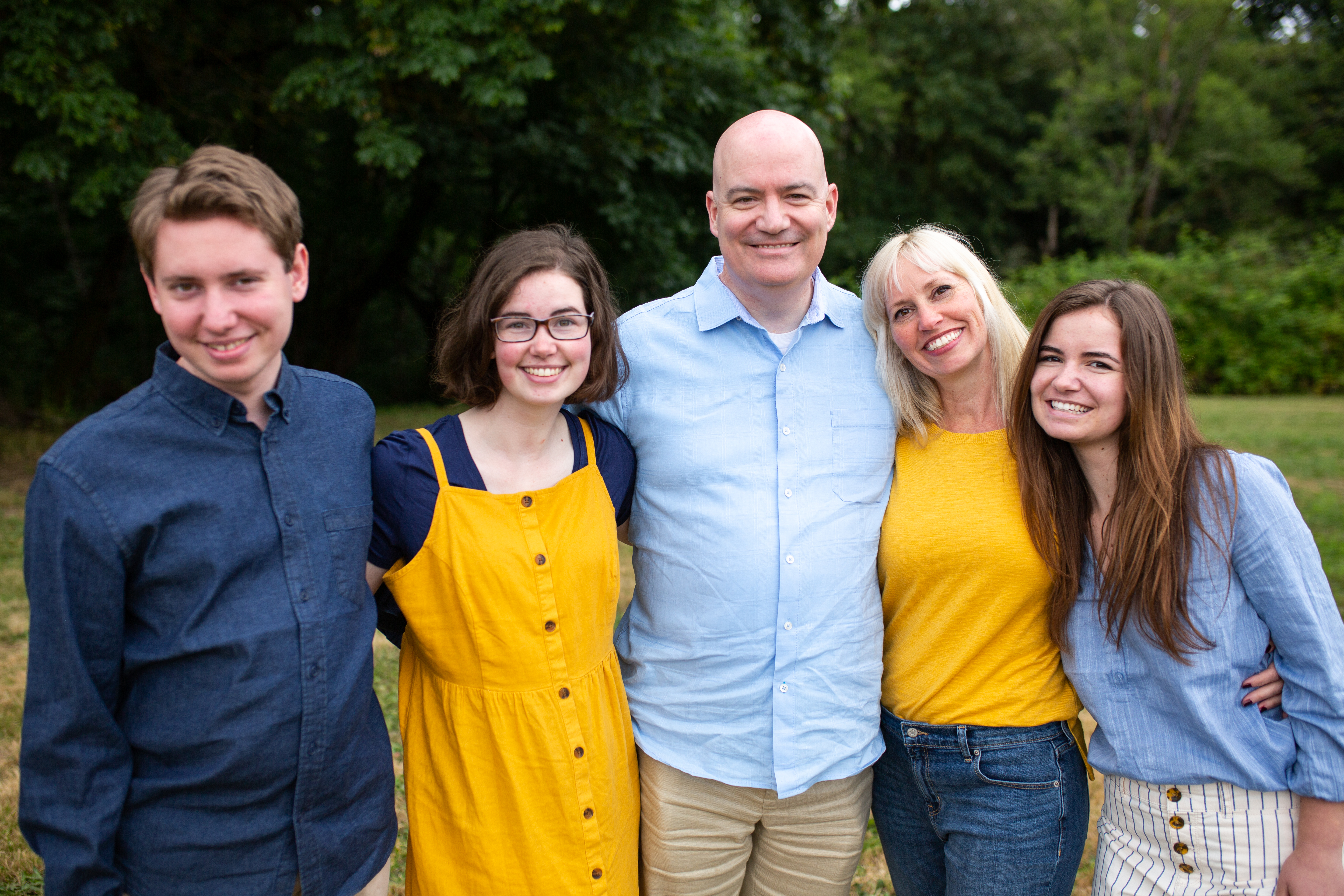 Painted portrait of a family of five.