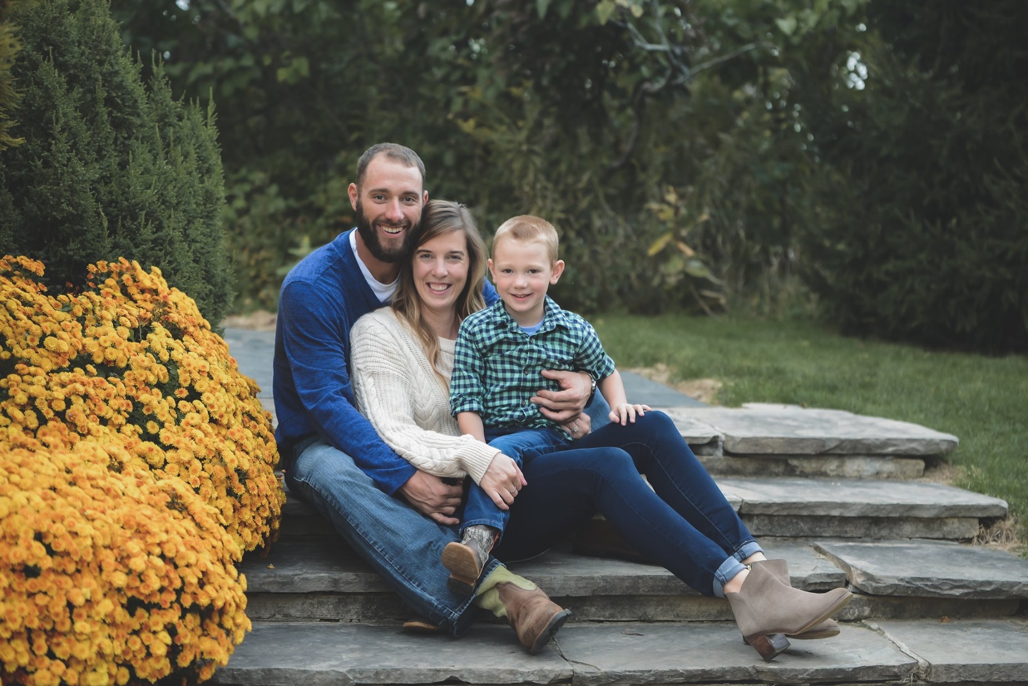 Family portrait: parents and young son sitting outdoors.