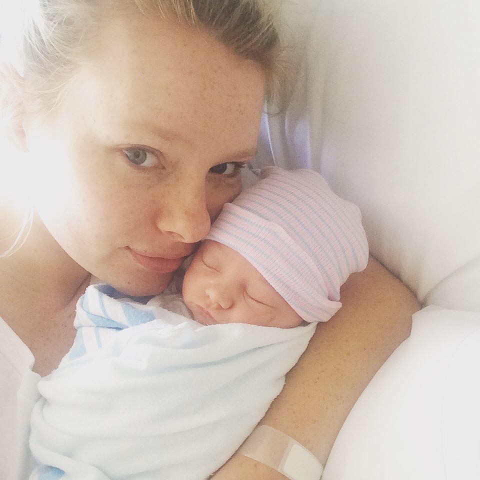 Painting of a mother tenderly holding her sleeping newborn baby.