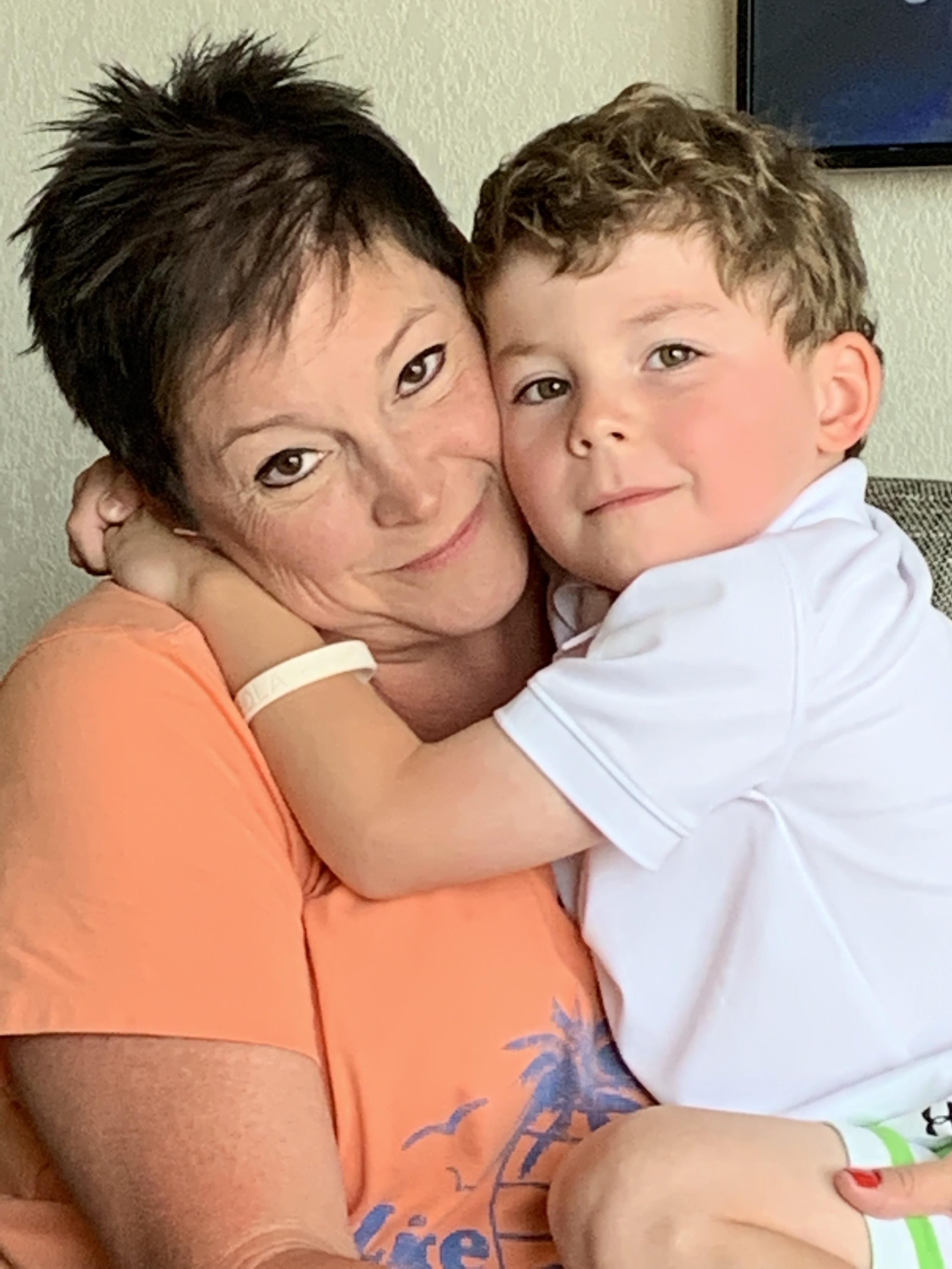 Painting of a woman and young boy embracing.