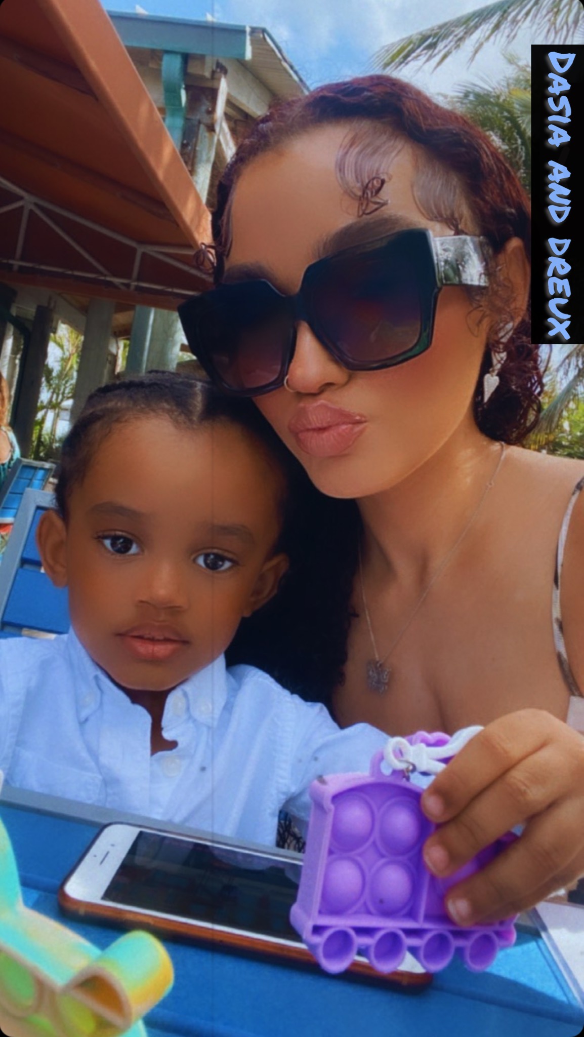 Painting of a woman wearing sunglasses and a young boy.