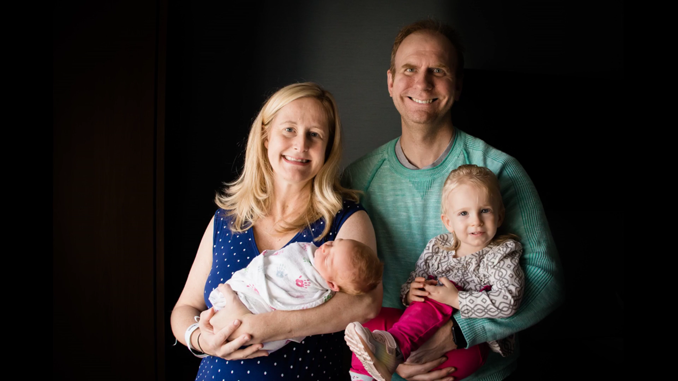 Family portrait painting: parents holding a newborn and toddler.