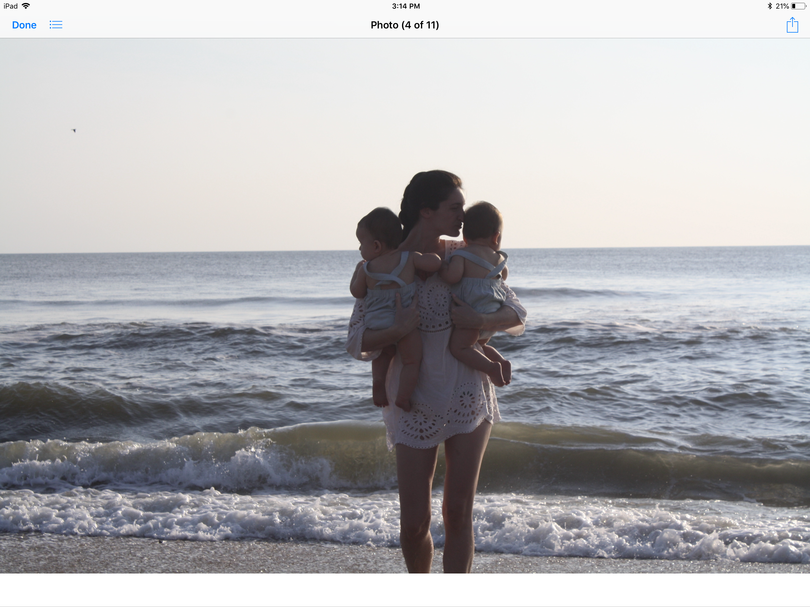 Woman holding twin babies at the beach