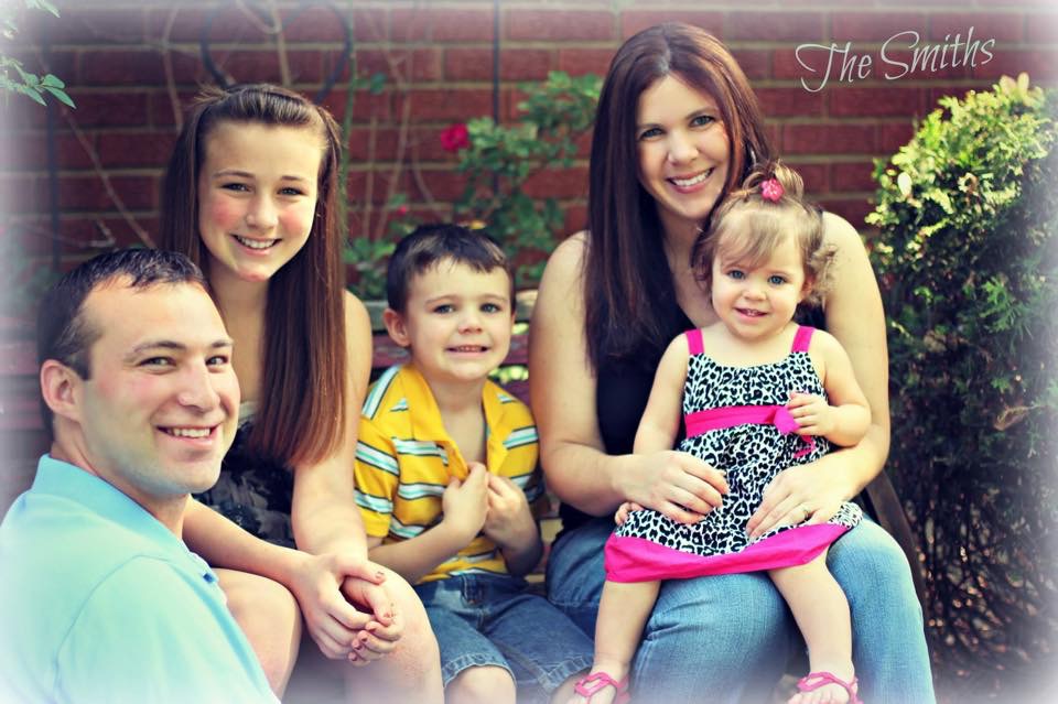 Painted portrait of a family: father, mother, teenage daughter, son, and toddler daughter.