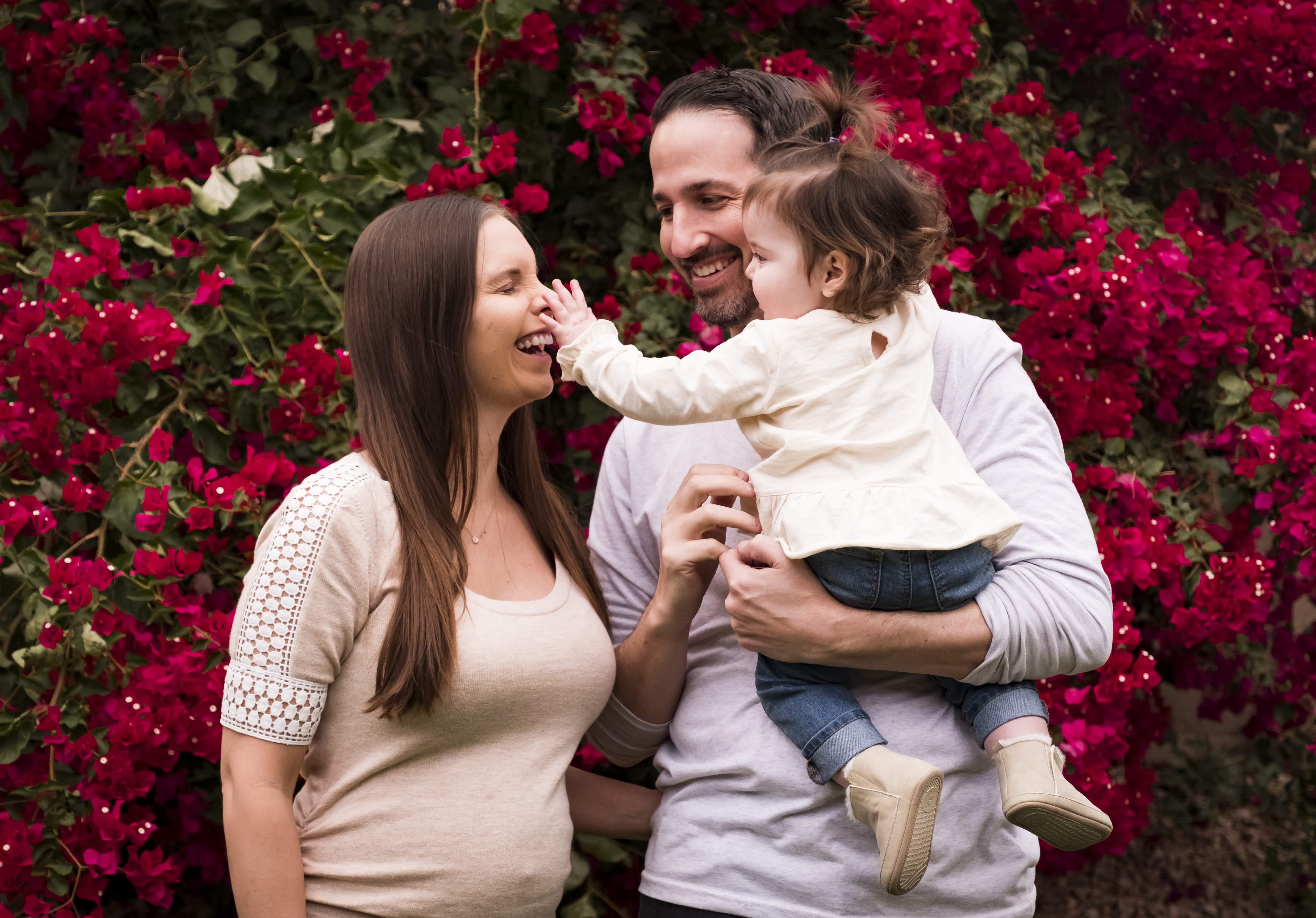 Family portrait, parents and toddler daughter in front of red flowers.