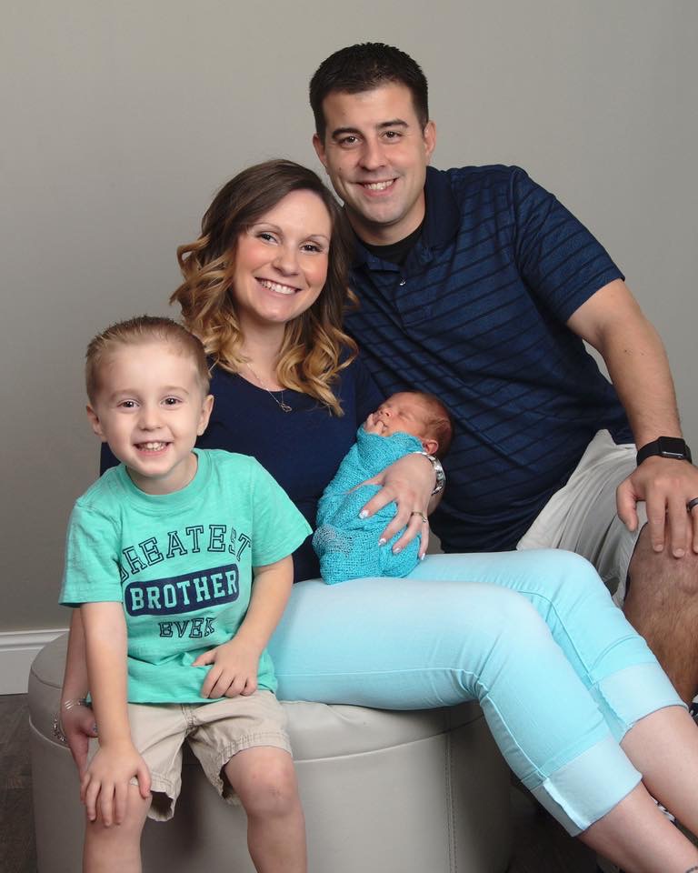 Family portrait painting: parents, toddler son, and newborn baby.