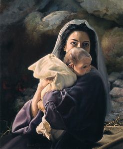 Painting of a mother tenderly holding her baby.