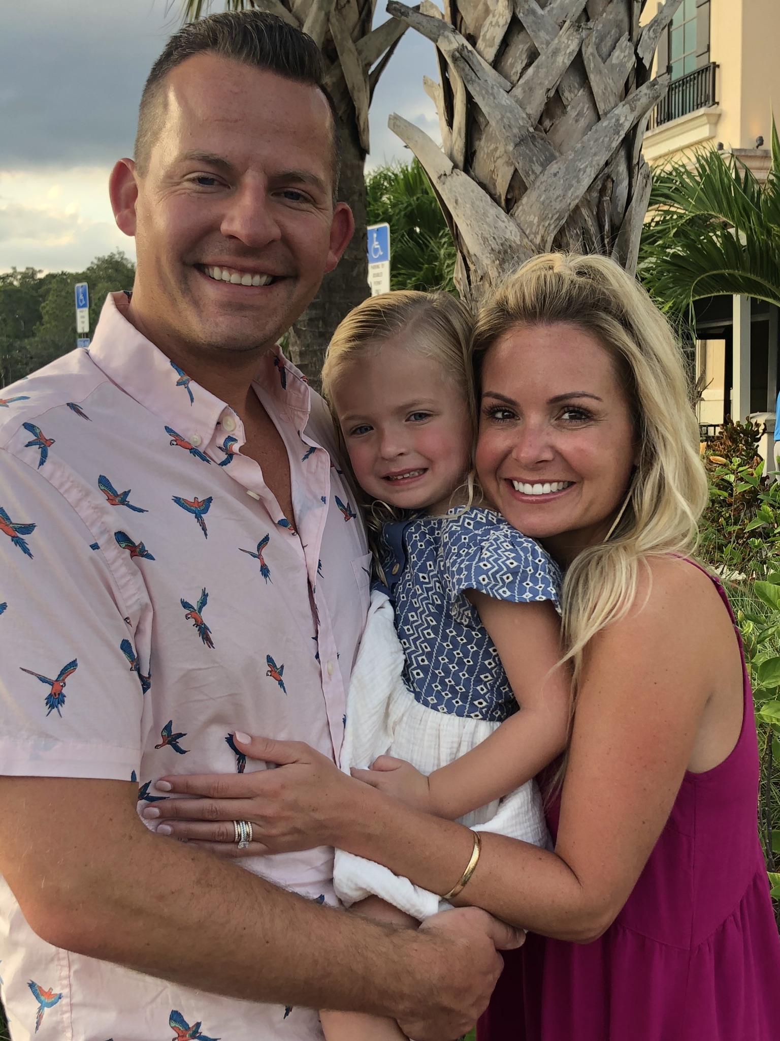 Family portrait painting, two adults and a toddler sticking out their tongues.