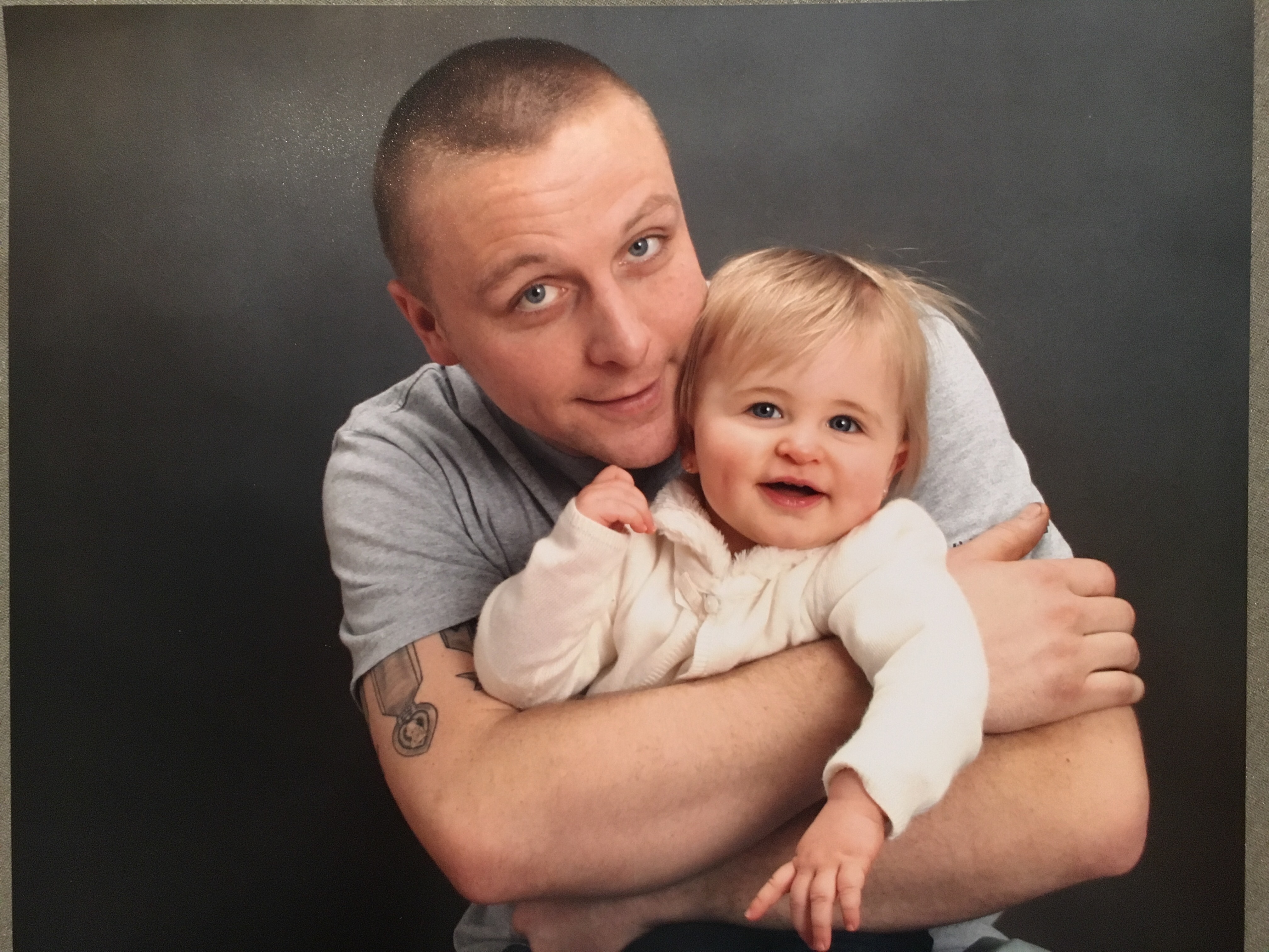 Oil painting of a father embracing his toddler daughter.