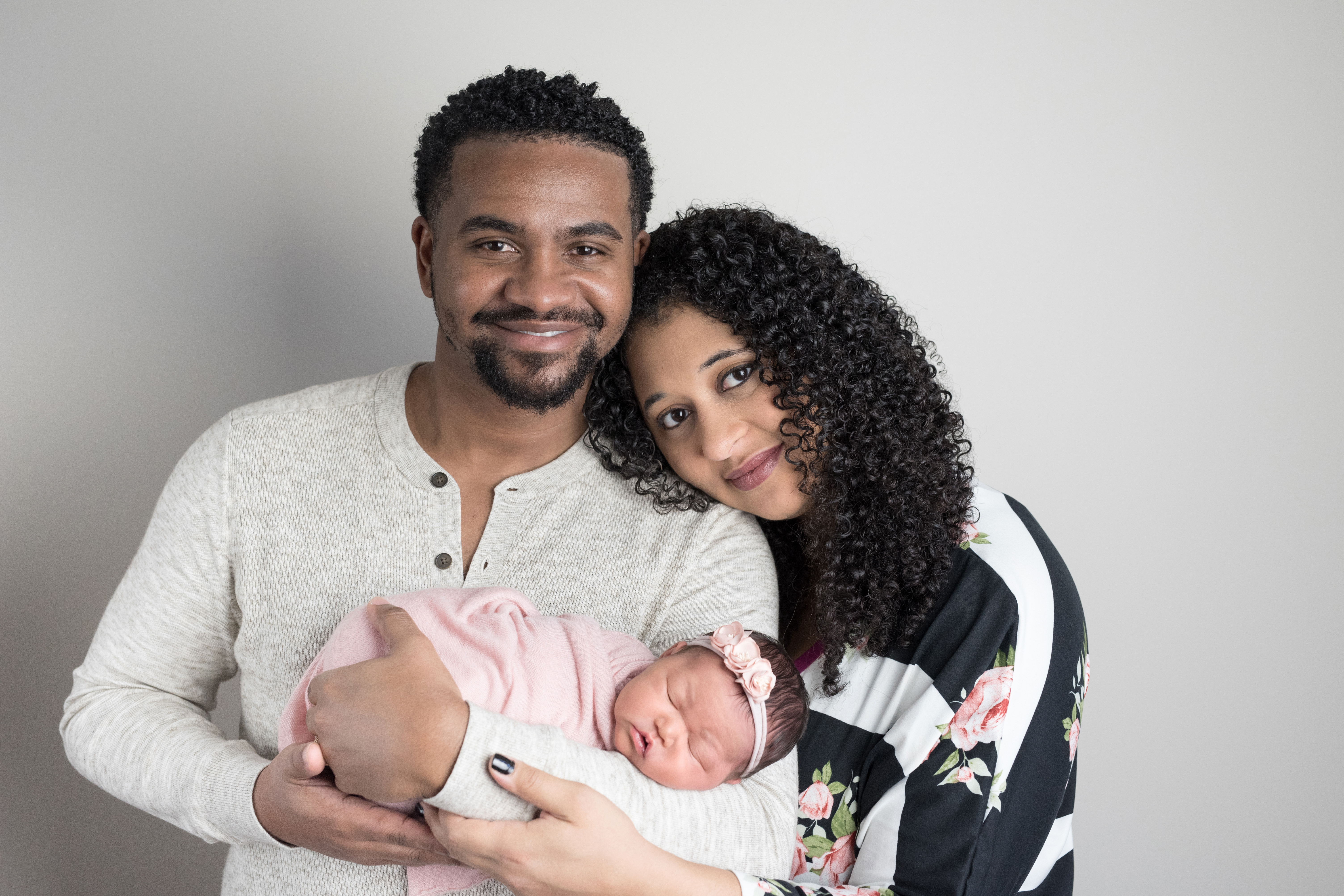 Painted portrait of a family: a man and woman holding their newborn baby.