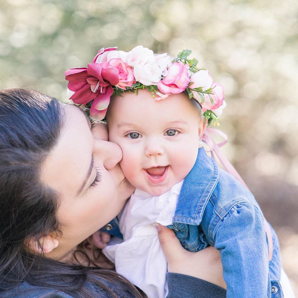 Painting of a mother kissing her baby daughter who is wearing a flower crown.