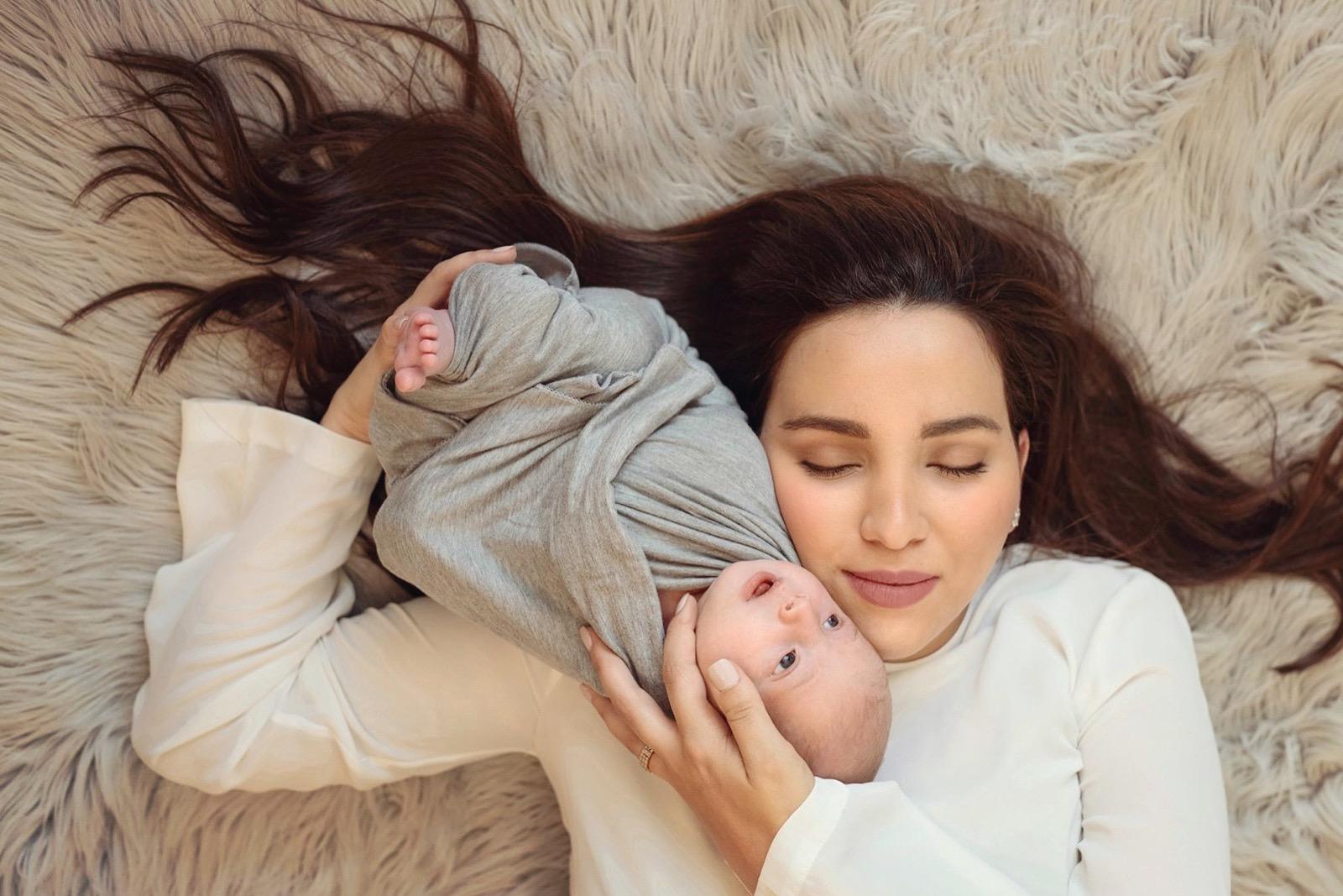 Smiling mother lying down cradling newborn baby.
