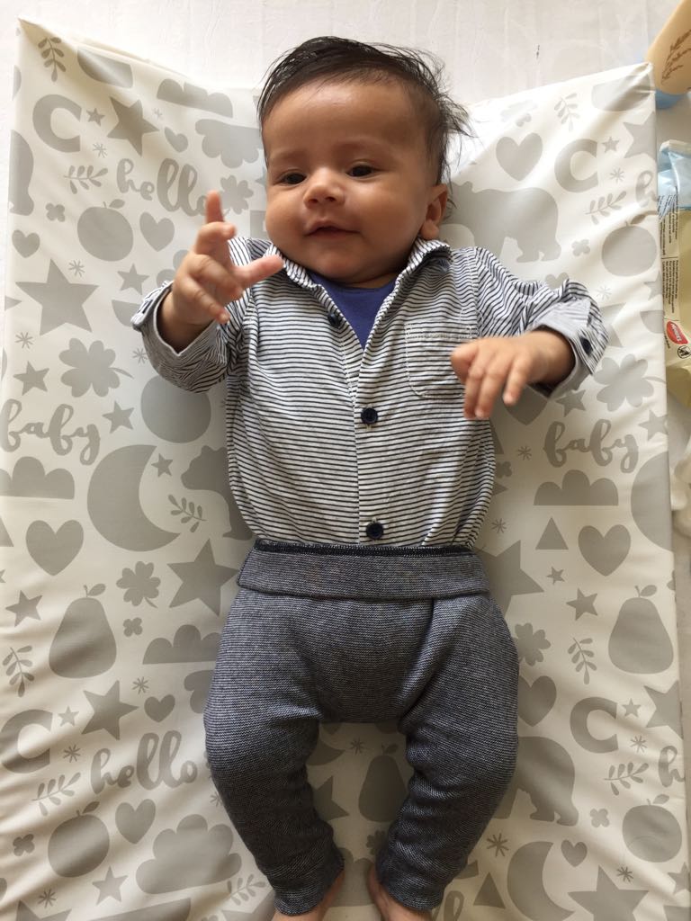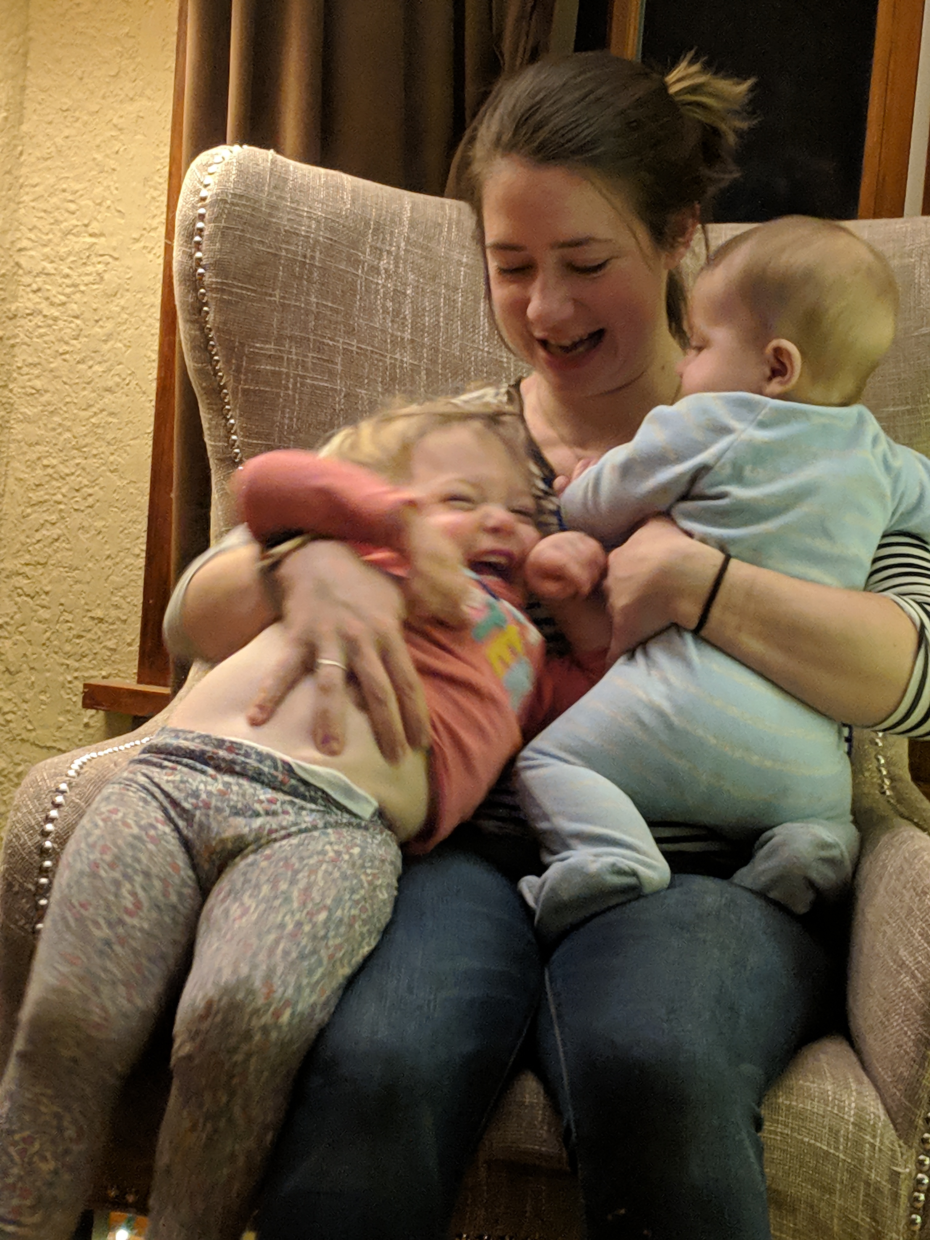 Painting of a mother holding a baby while a toddler climbs on her back.