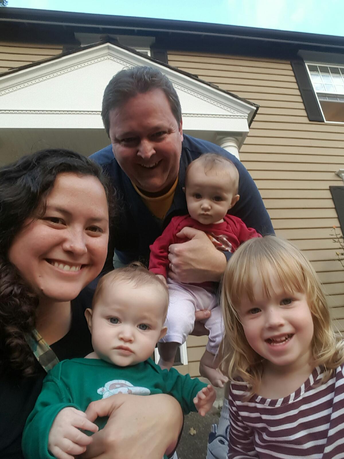Family portrait painting, parents and three young children in front of house.